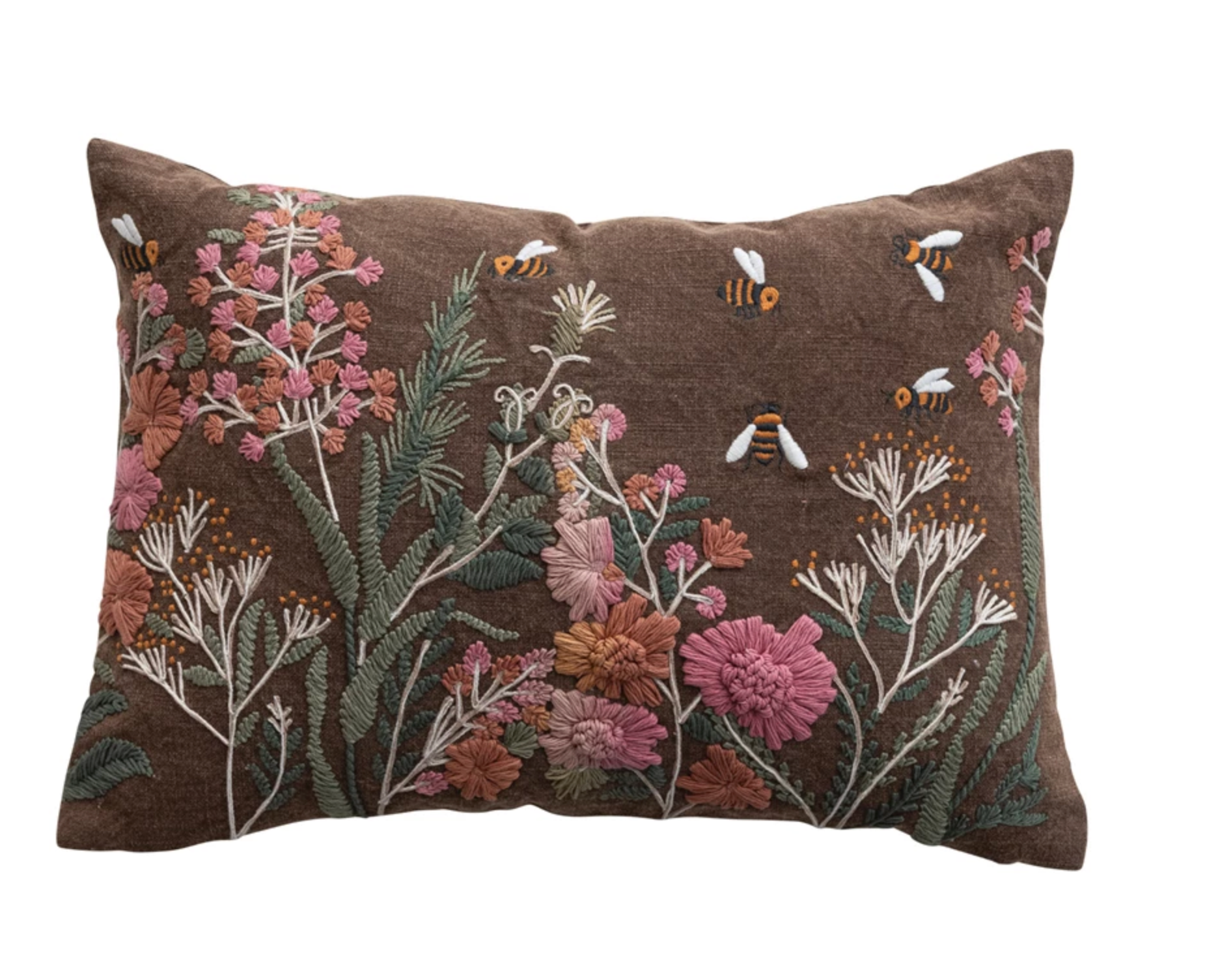 Stonewashed Cotton Slub Lumbar Pillow with Hand-Embroidered Flowers & Bees