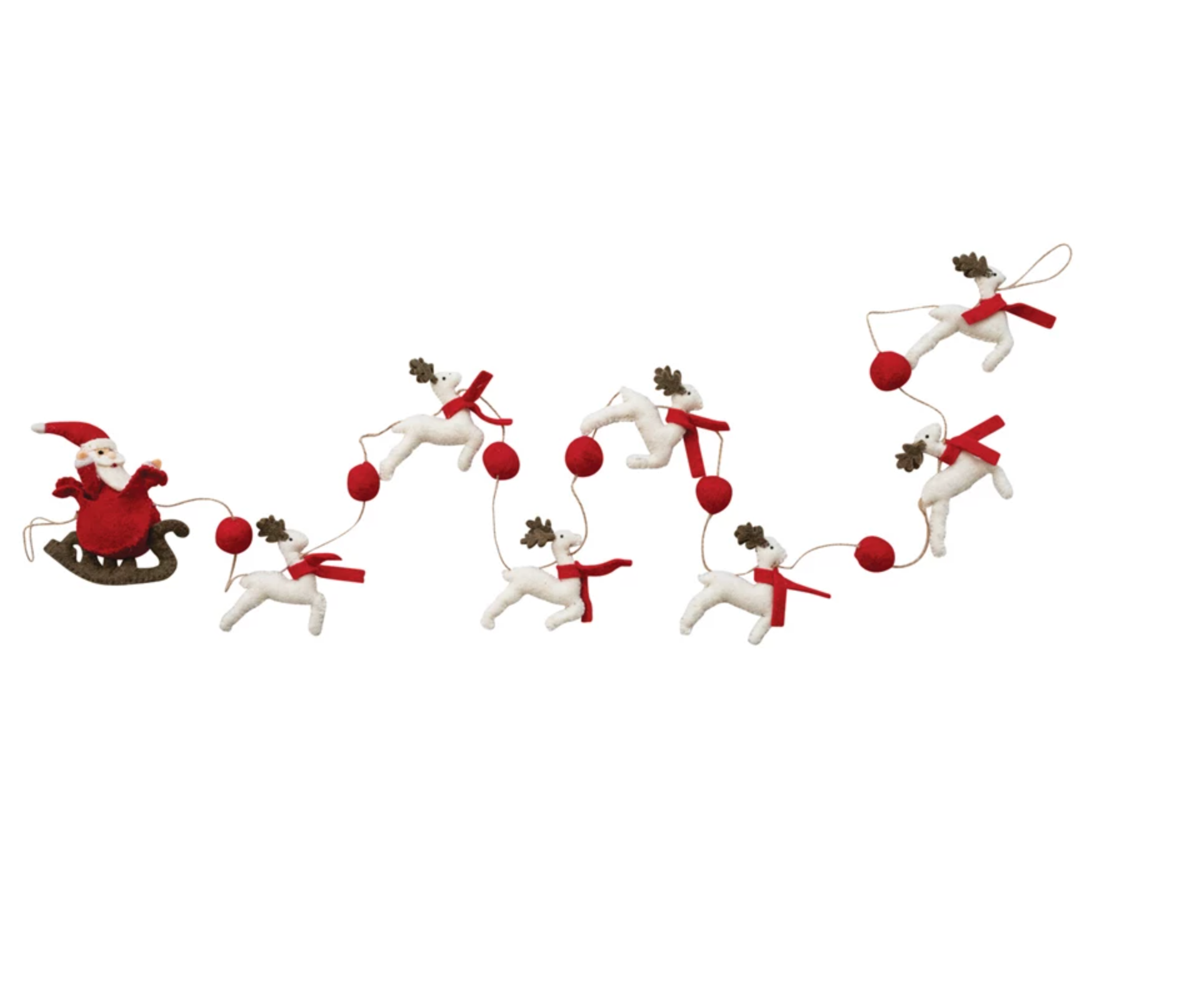Handmade Wool Felt Santa In Sleigh & Reindeer Garland with Jute Cord