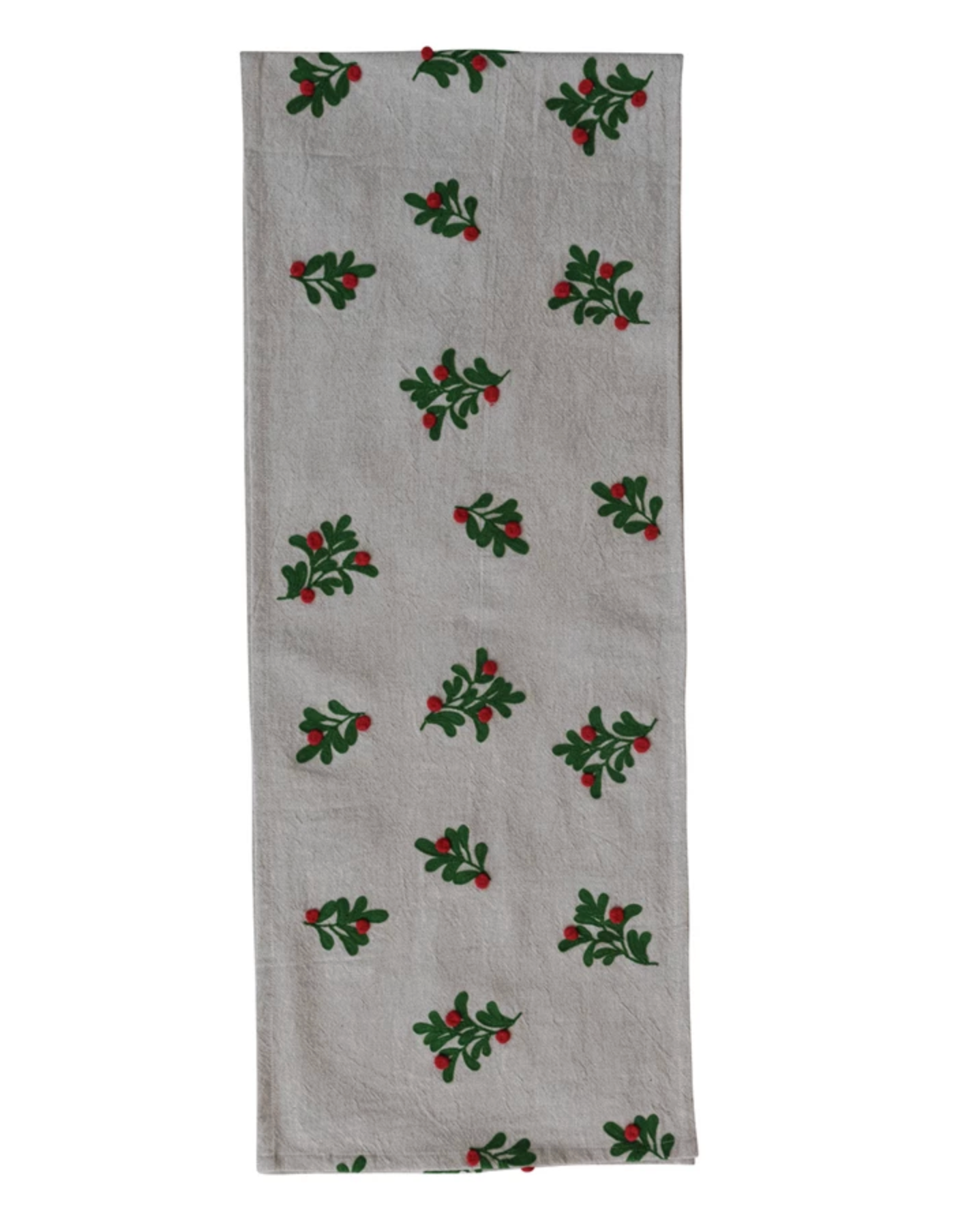 Table Runner with Embroidered Mistletoe Pattern & Pom Poms, Natural
