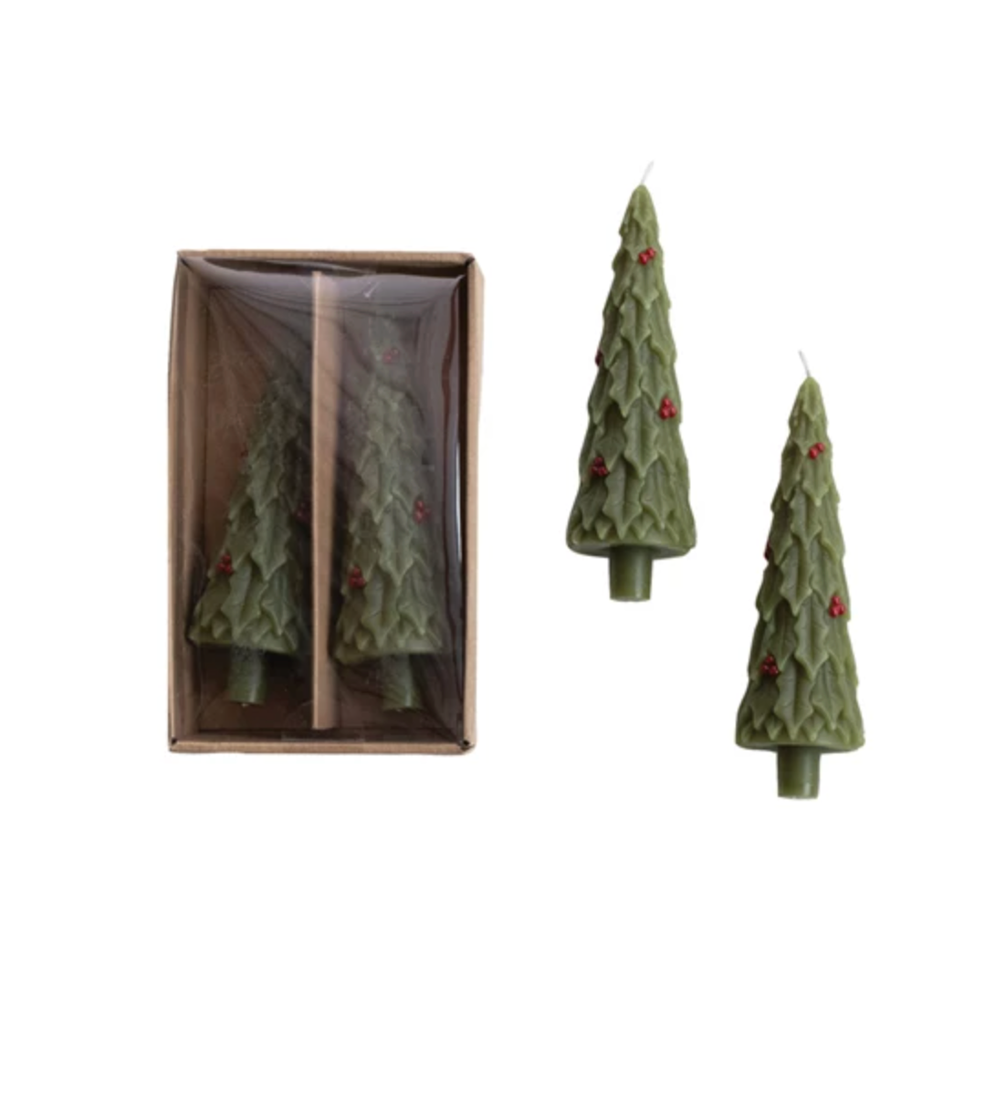 Unscented Tree Shaped Taper Candles in Box with Holly, Set of 2