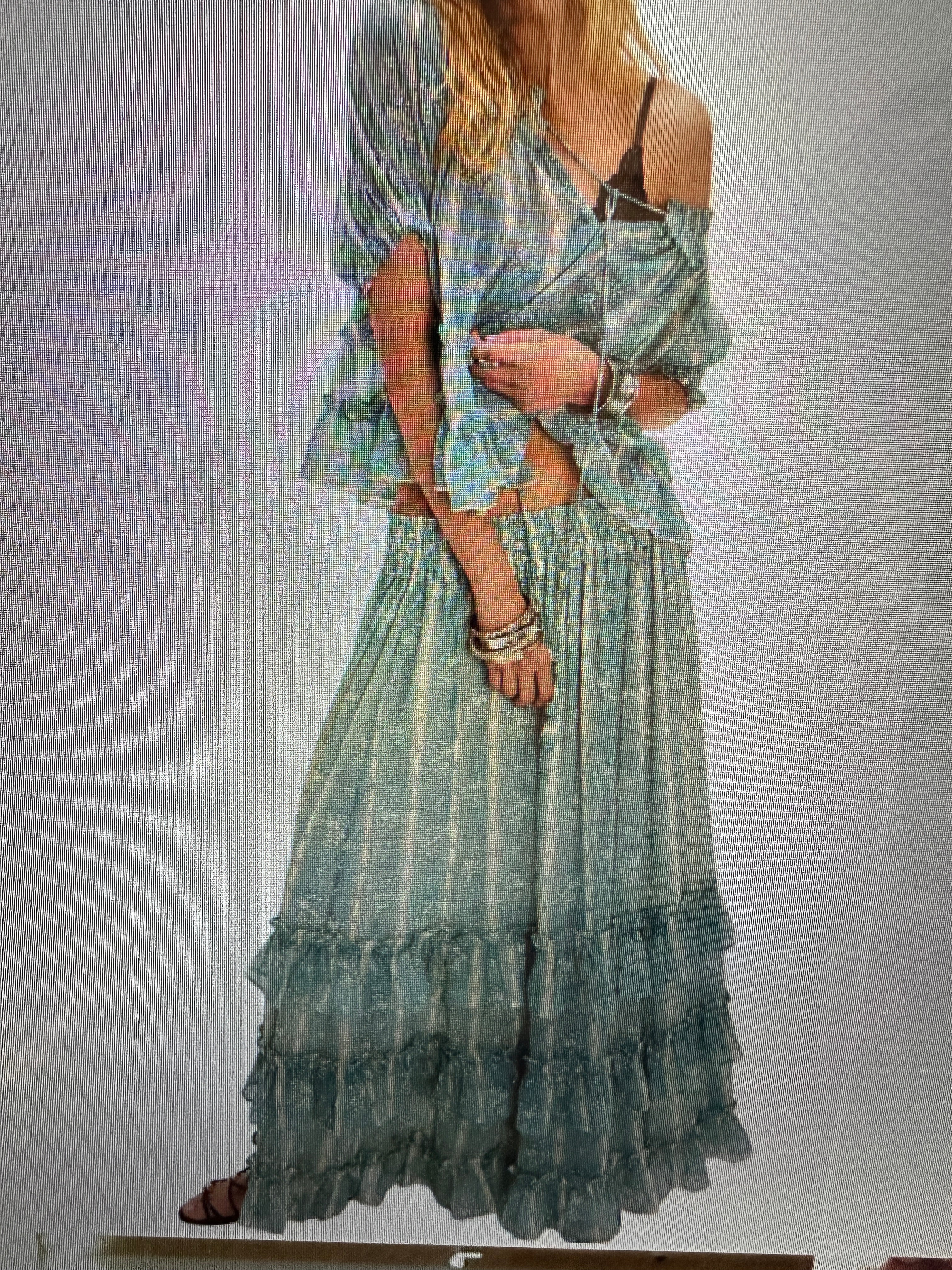 - Top: split neck with self-ties, pullover style, short puff sleeves, smocked at collar and cuffs, swing silhouette, ruffles at hem