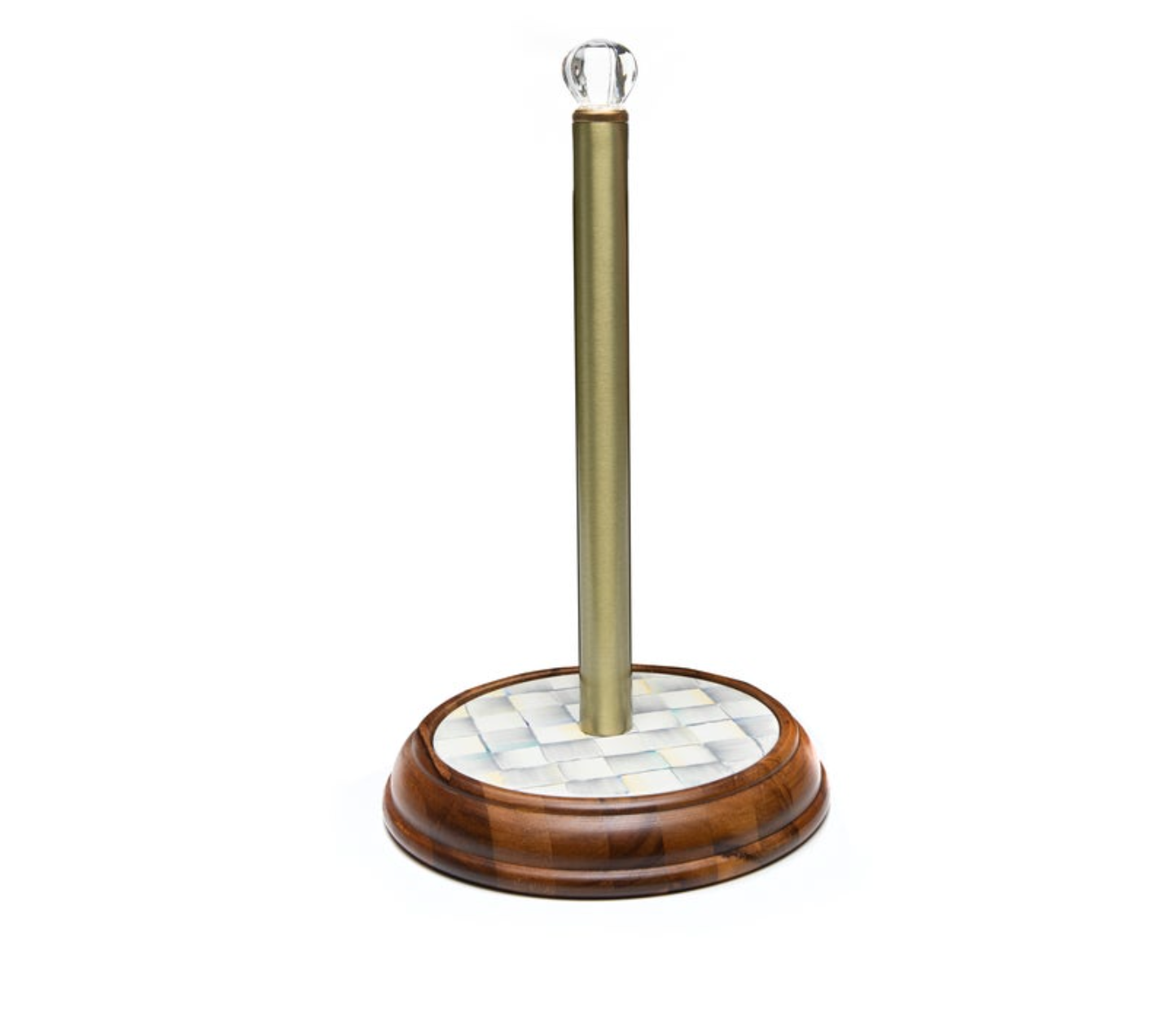Every kitchen needs a paper towel holder, so make it a Sterling Check Paper Towel Holder! It features hand-painted, color-dragged checks in a range of grey hues on enamel with a wood base, stainless-steel center post, and an elegant clear glass finial.