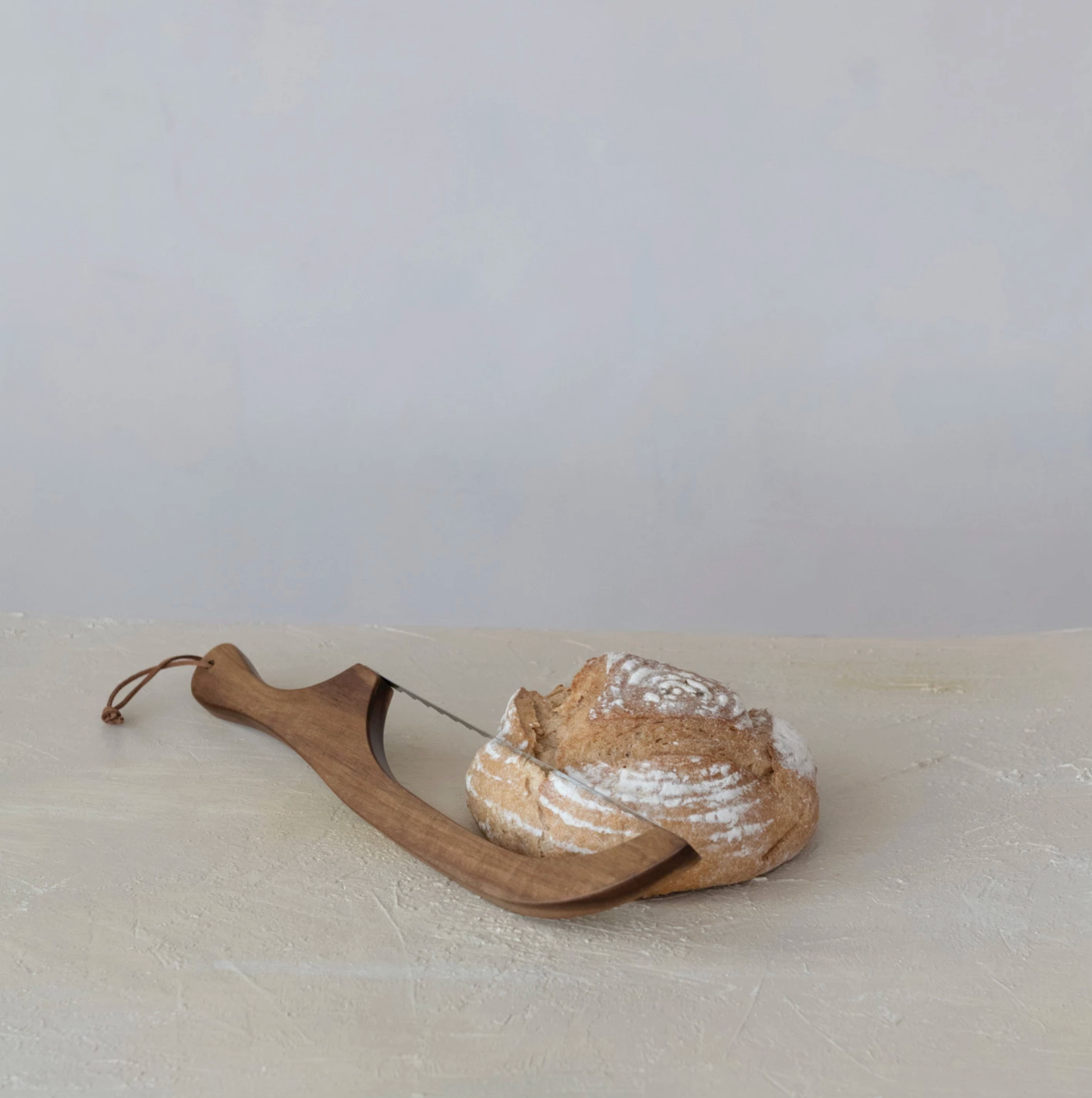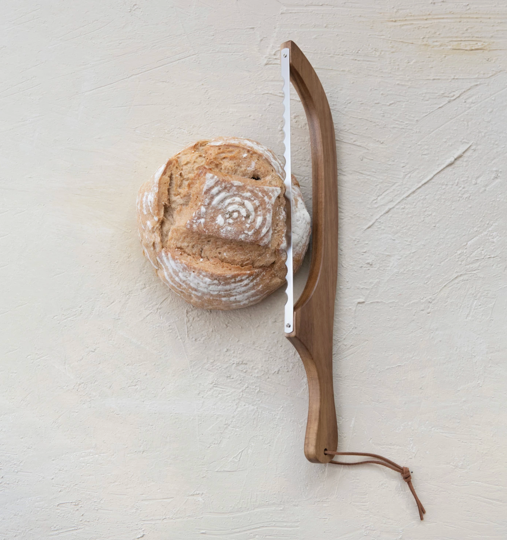 Wood Bread Bow Knife w/ Stainless Steel Blade & Faux Leather Tie, Natural