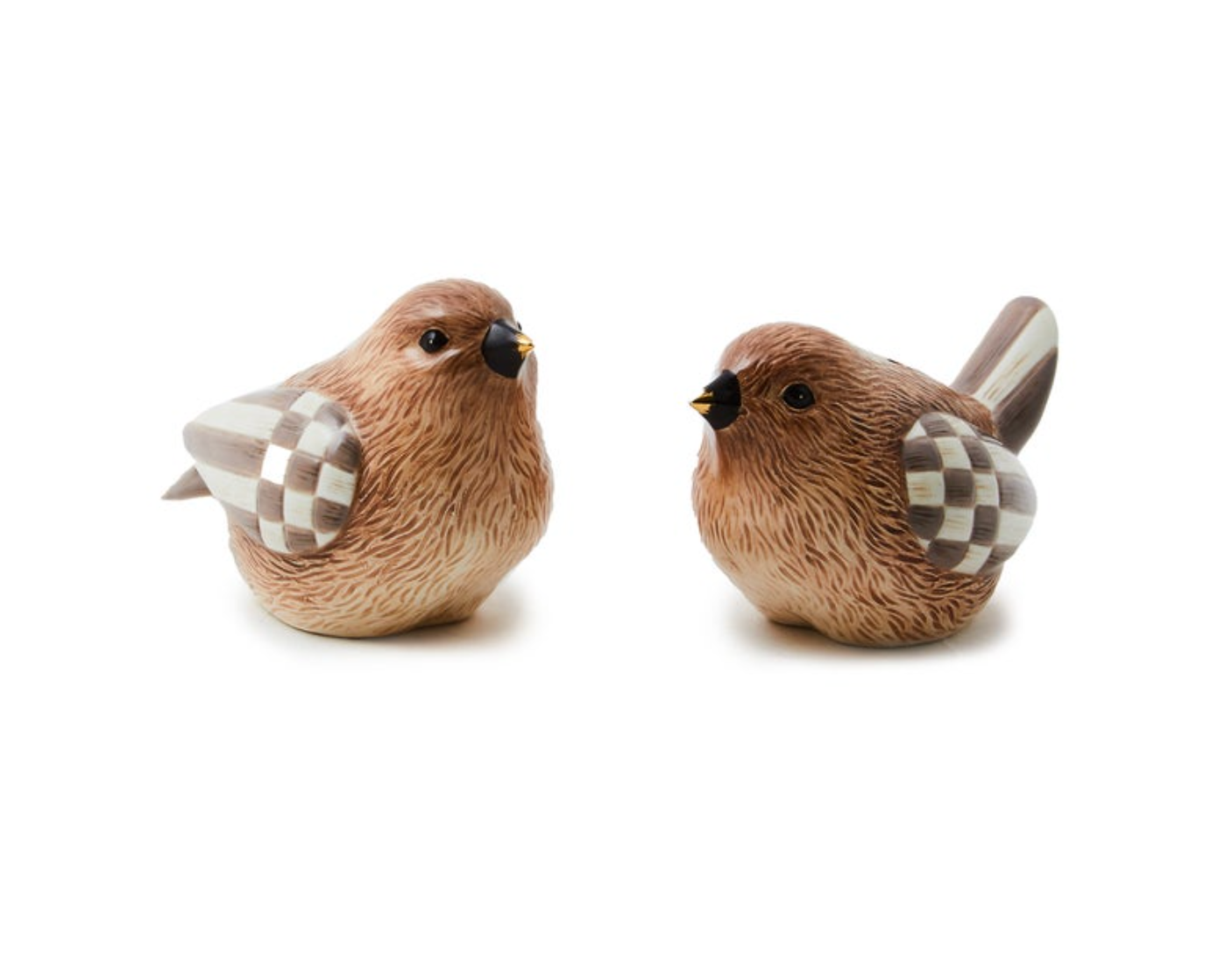 This hand-painted, two-piece ceramic bird salt and pepper set is accented with Mocha Check and finished with gold lustre. Elegantly packaged, it makes a great gift, too.