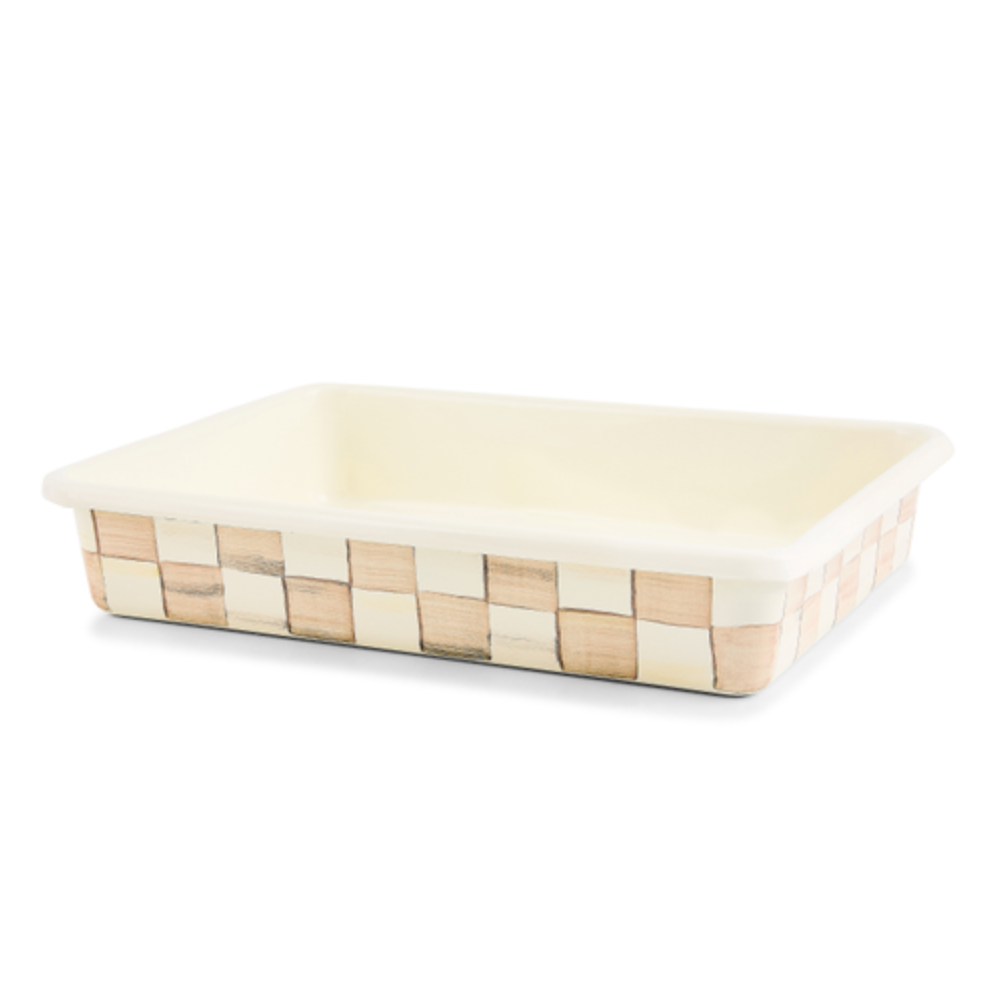 Heavy-gauge steel underbody, hand-glazed and painted with Mocha Check decoration. Oven safe to 400 degrees F. Pieces may vary due to the handmade nature of each product. Imported.