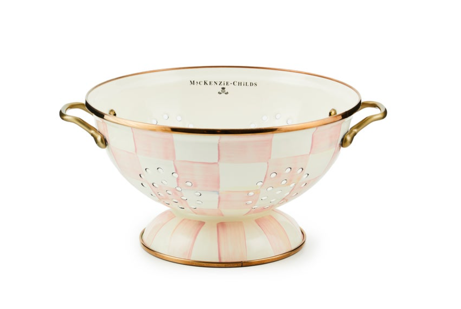 For kitchen preparations with personality, look no further than the Large Rosy Check Enamel Colander. The steel underbody makes this number a workhorse, and the hand-painted, color-dragged checks in a range of rosy hues and antiqued brass-finish handles give some pizzazz to scrubbing potatoes and sass to straining salads.