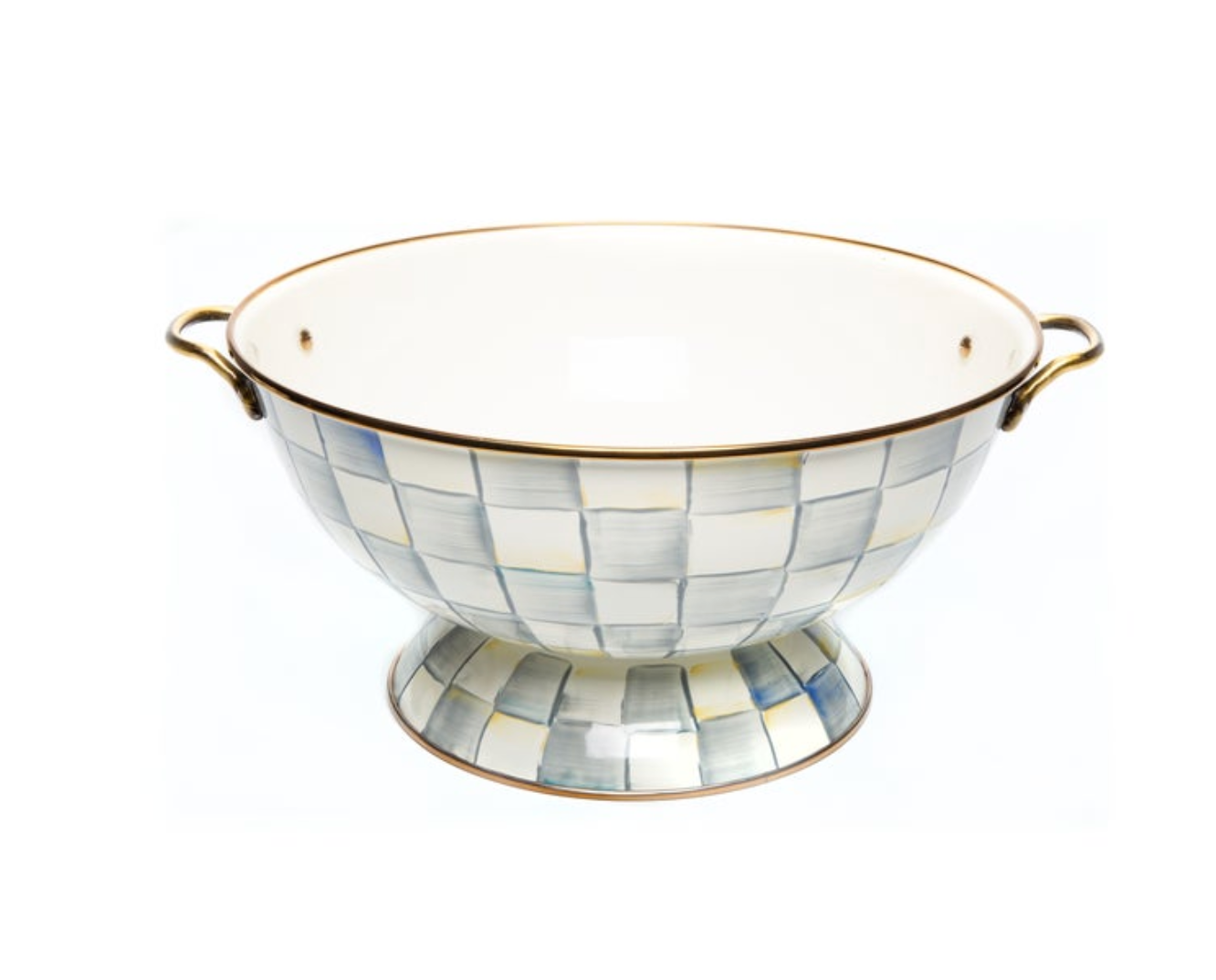 The Sterling Check Enamel Everything Bowl, right-sized for beverages on ice or orchard-picked apples, is a must-have for parties and for everyday use. Heavy-gauge, hand-glazed steel underbody with hand-painted, color-dragged checks in subtle shades of grey, a bronzed stainless-steel rim, and antiqued brass-finish handles.