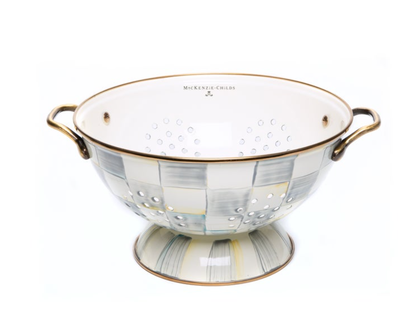 For kitchen preparations with personality, look no further than the Large Sterling Check Enamel Colander. The steel underbody makes this number a workhorse, and the hand-painted, color-dragged checks in subtle shades of grey and antiqued brass-finish handles give some pizzazz to scrubbing potatoes and sass to straining salads.