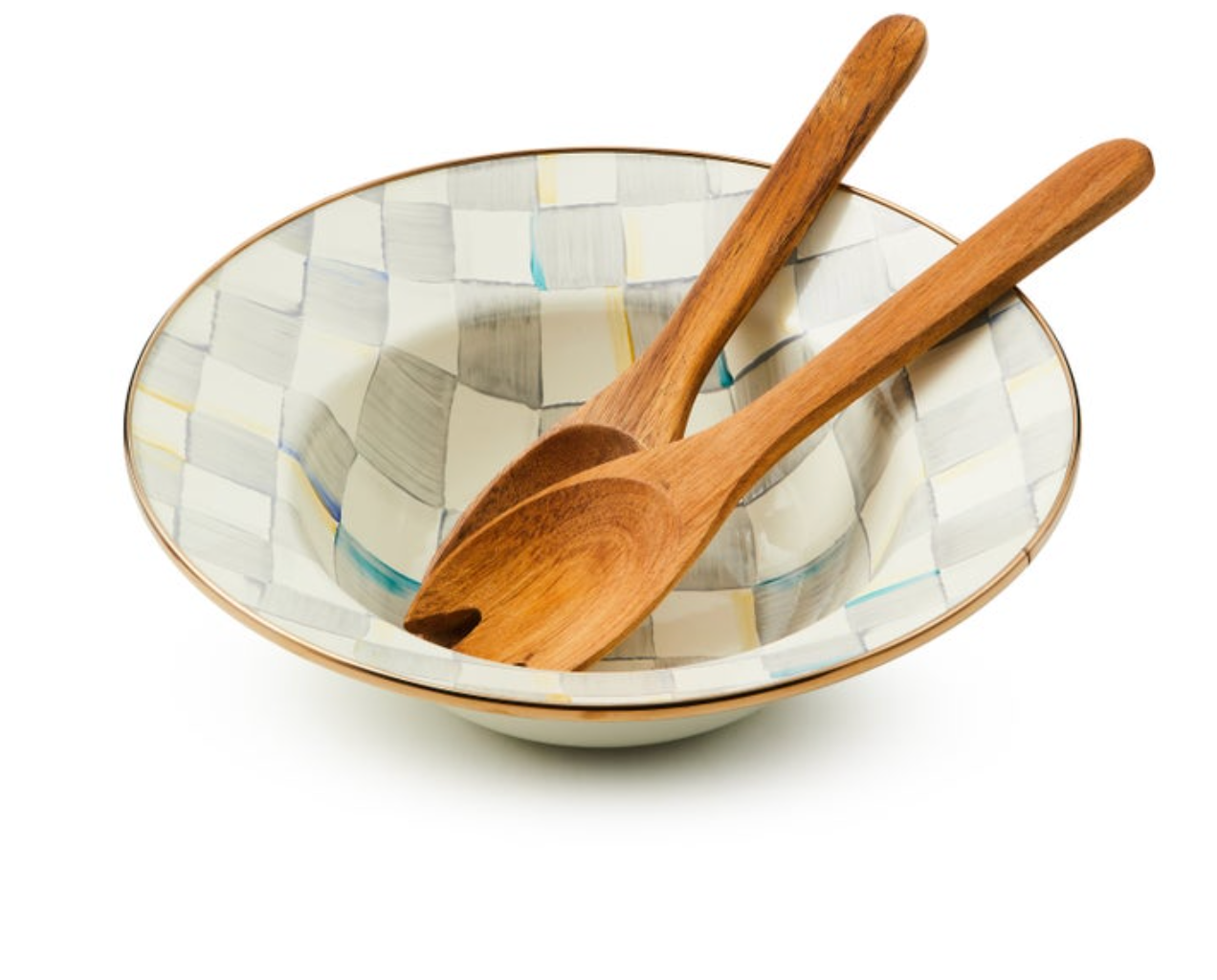 The Sterling Check® Salad Serving Set is a must-have for The Entertaining Kitchen™! It includes the Sterling Check Serving Bowl, featuring grey checks hand-painted on a heavy-gauge, hand-glazed steel underbody, rimmed in bronzed stainless steel, accompanied by acacia wood salad servers. Comes gift boxed, too, so it’s the perfect present for the newly wed or the newly nested.
