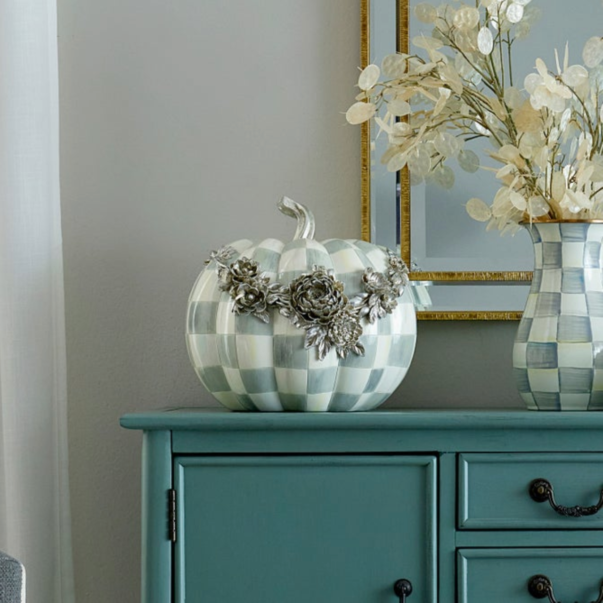 Take your pick from our most unusual pumpkin patch with the Sterling Check® Silver Floral Garland Pumpkin, featuring our hand-painted grey check pattern that’s embellished with dimensional flowers done in silver leaf.