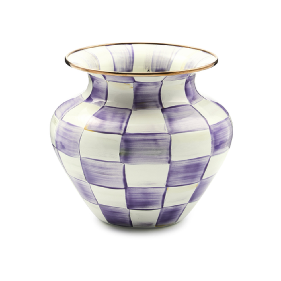 Heavy-gauge, hand-glazed steel underbody with hand-painted Violet Checks, rimmed in bronzed stainless steel. Pieces may vary due to the handmade nature of each product. Imported.