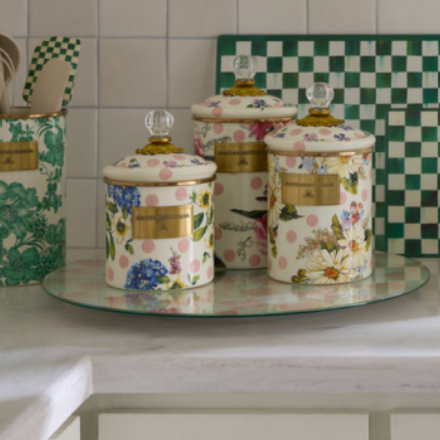 Heavy-gauge, hand-glazed steel underbody with hand-applied transfers, rimmed in bronzed stainless steel. Brass and glass accents. Silicone seal inside lid. Pieces may vary due to the handmade nature of each product. Imported.