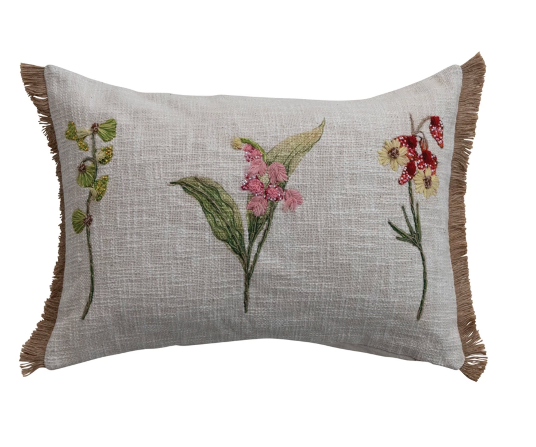 Cotton Slub Lumbar Pillow with Botanicals, Embroidery, Beads & Jute Eyelash Fringe