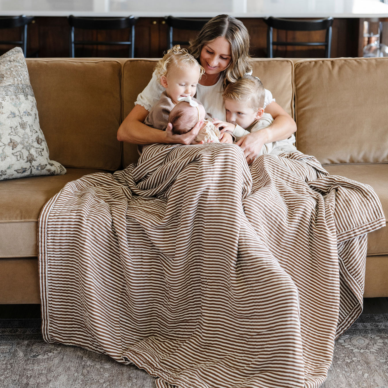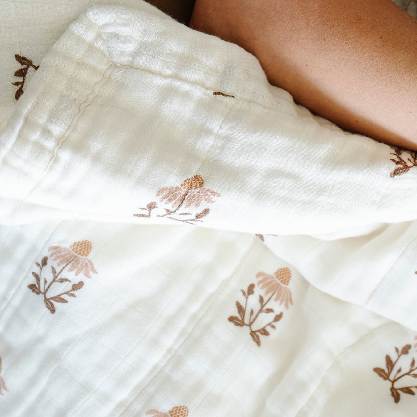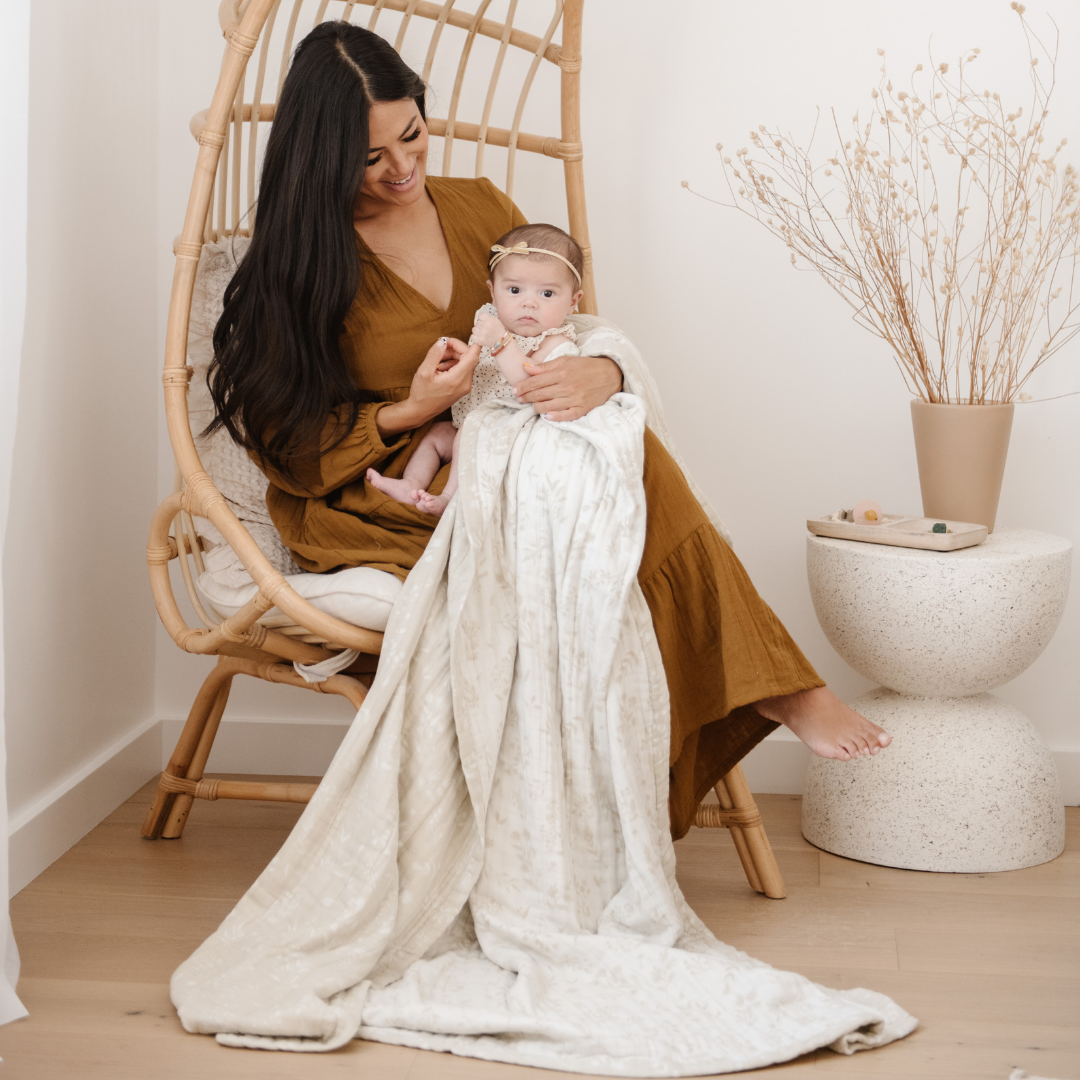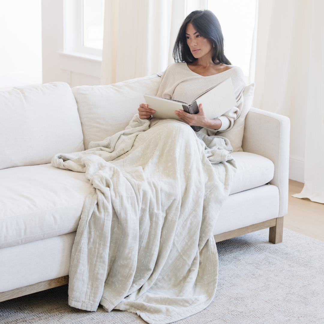 *The Olivia and Milo blankets are discounted because the color is slightly darker from what the pictures show. What could be better than our original airy and oh-so-soft muslin fabric? Times it by four! The soft and supple muslin fabric made from bamboo is now layered into this four-layer muslin quilt. Perfect for those muslin-lovers that want a little something extra. Available in a variety of our custom-made prints, detailed with a stitched quilted design and then bound with a one-inch border; this blanket is sure to become a favorite snuggle companion everywhere you go. * Luxuriously Soft: 70% rayon from Bamboo, 30% cotton to ensure incredible softness and comfort.