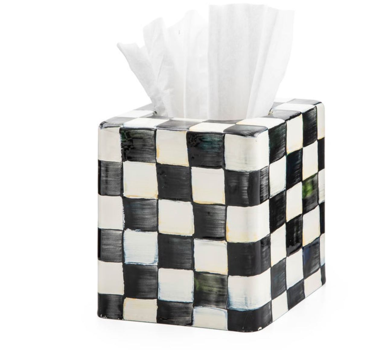 Keep a Courtly Check® Enamel Boutique Tissue Box Cover within reach in every room-powder room, bedroom, and kitchen. The simple elegance of our most popular pattern makes it part of a useful gift set to accent any decor with matching soap dish, tumbler, and waste bin. With a subtle jewel-tone palette woven by an artisan’s brush through the glossy, hand-painted, high-contrast checks, we’ve yet to find a room that doesn’t look good with Courtly Check.