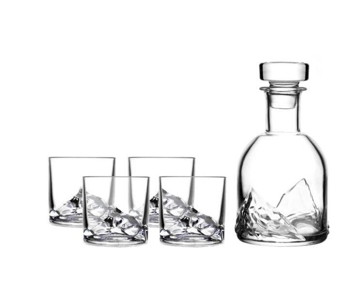 Get the complete set of a Crystal Glass Carafe with mountain relief and 4 Everest Glasses for the most impressive Whiskey experience!
