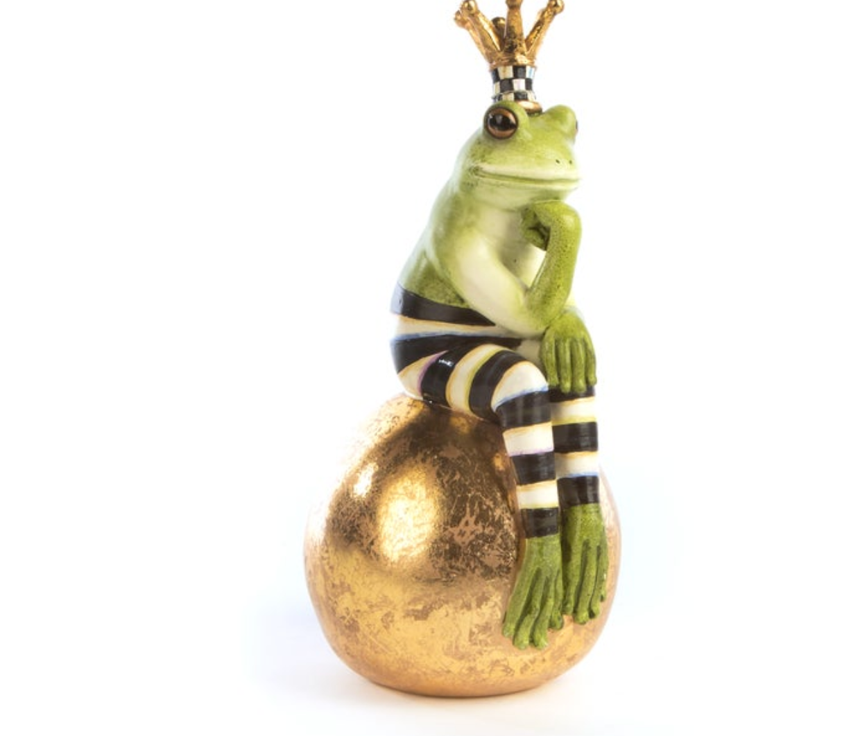 Fergal Frog on Ball, a handsome amphibian decorated with hand-painted Courtly Stripes and Courtly Checks®, rests on a gold-leafed ball, contemplating life by our farm pond as the weather warms.
