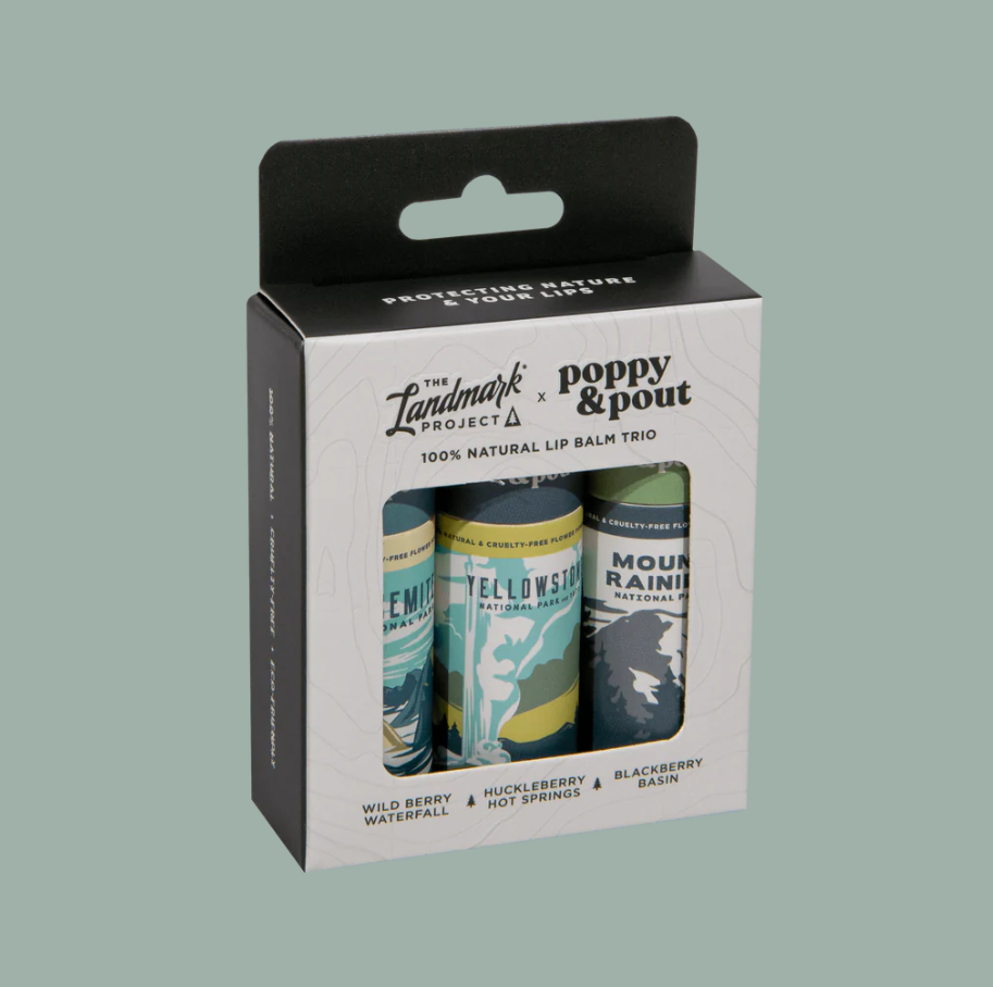 Shop our new limited edition The Landmark Project x Poppy & Pout lip balm trio. This National Parks-inspired lip balm gift set is a celebration of nature's finest flavors, each one reflecting the essence of America’s most beloved national parks. The "Cool" berry inspired lip balm trio comes with three lip balms, Mount Rainier Blackberry Basin, Yellowstone Huckleberry Hot Springs, and Yosemite Wild Berry Waterfall. With each swipe, you'll experience the perfect balance of berry sweetness, leaving your lips feeling soft and hydrated.