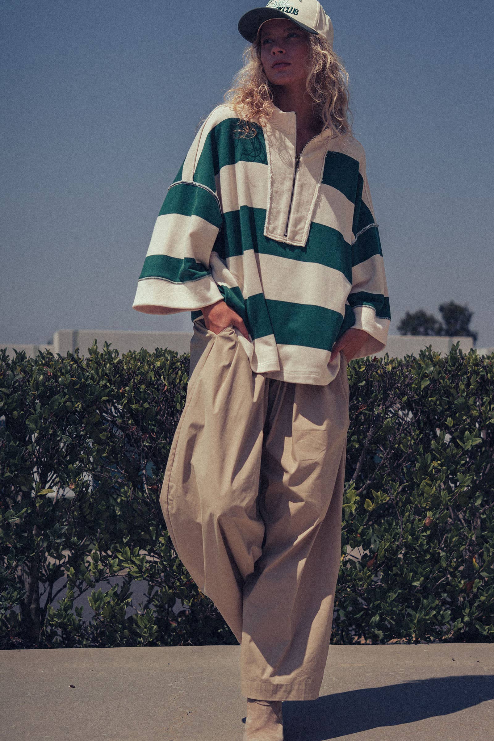 Modern half-zip pullover featuring bold horizontal stripes and contrast trim details, crafted with an oversized silhouette and premium cotton blend for ultimate comfort and style. The relaxed fit with dropped shoulders and ribbed trim creates an effortlessly chic look perfect for casual layering. Ideal for both weekend lounging and everyday outings. Color may vary slightly due to monitor resolution.