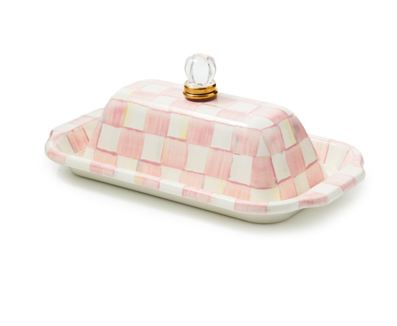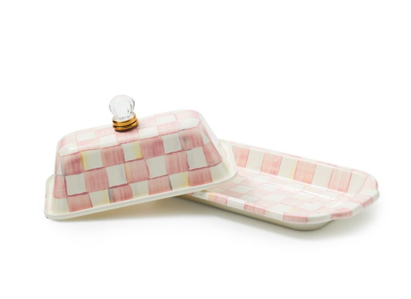 Inspired by our Aurora home’s history in dairy farming, the Rosy Check Enamel Butter Box brings a dash of style to a utilitarian dish and cover. It features heavy-gauge, hand-glazed steel underbody with hand-painted, color-dragged checks in a range of rosy hues and topped with an elegant clear glass knob.