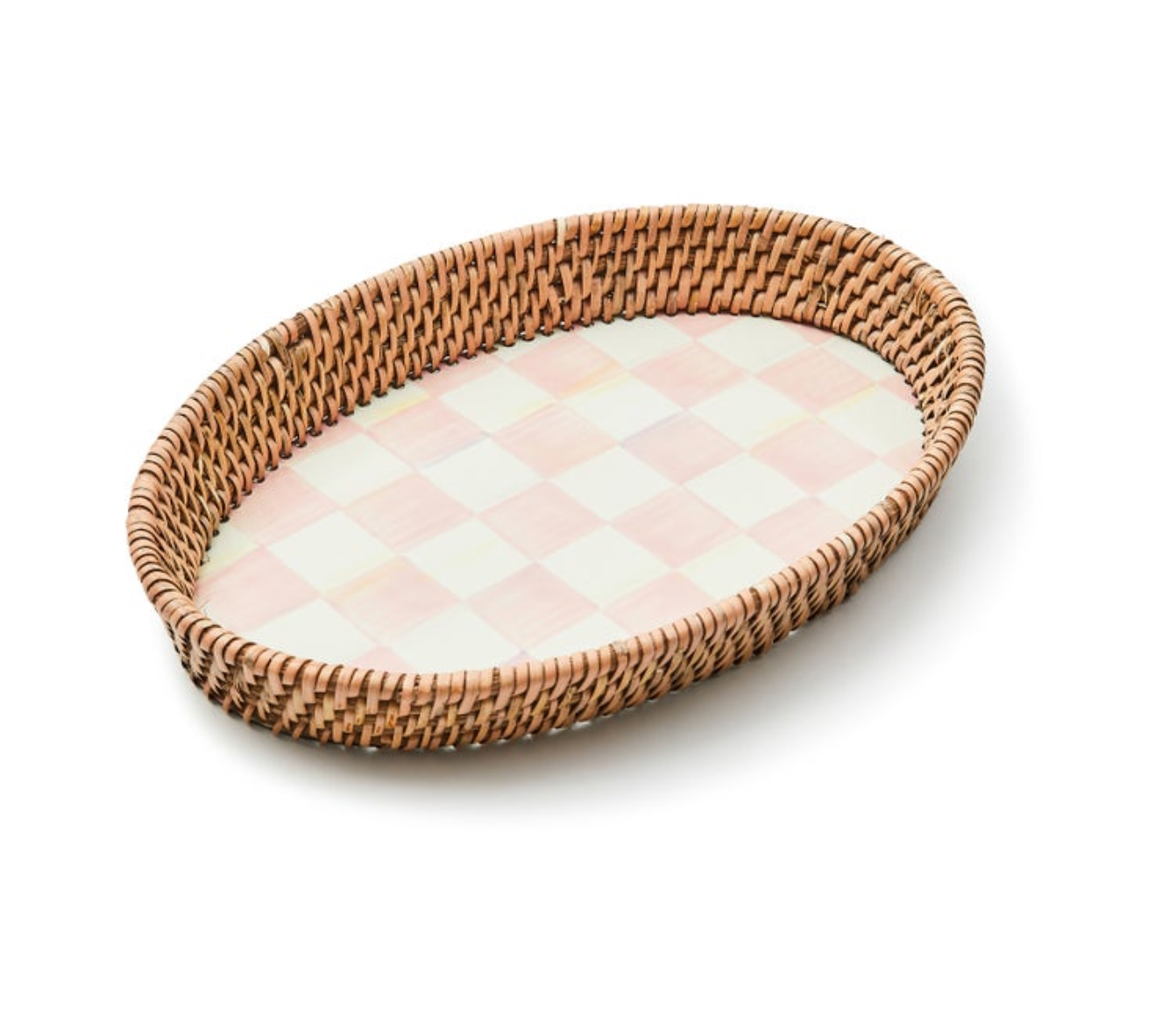 As practical as it is pretty, the Rosy Check® Small Enamel & Rattan Serving Tray mixes woven natural rattan against our Rosy Check that is hand-painted onto a steel base.