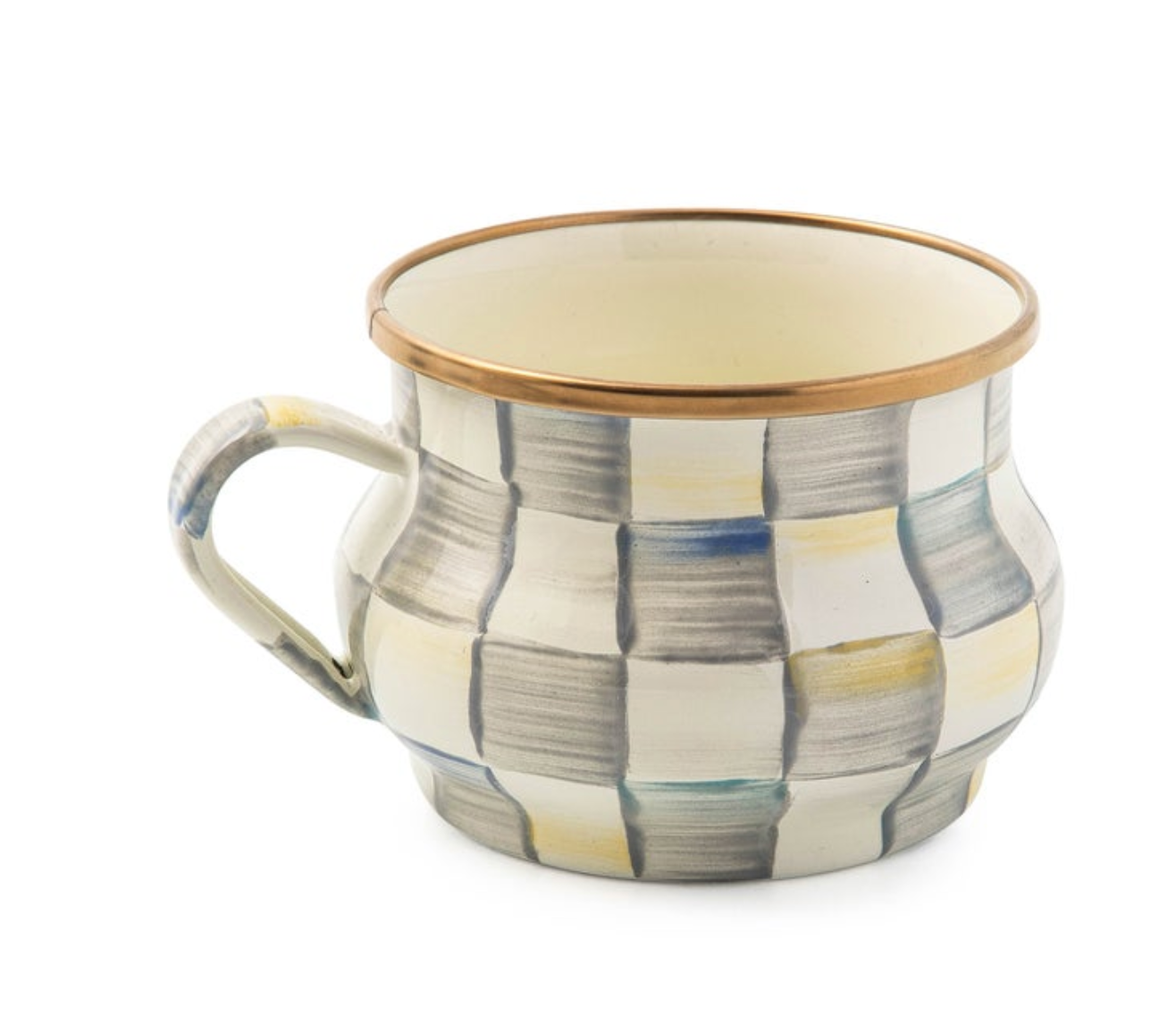Warm up to a bit of cocoa or chai in our Sterling Check® Teacup. The heavy-gauge steel underbody is glazed with hand-painted, color-dragged grey checks and rimmed in bronzed stainless steel.
