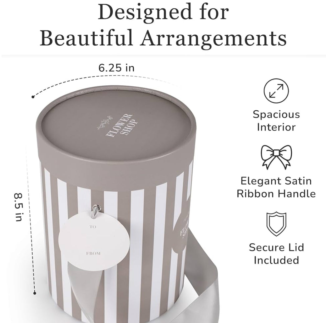 - ELEGANT FLOWER BOXES – Our round flower box set comes in solid black, gray, or white, featuring a satin ribbon handle to add a sophisticated touch to any arrangement.