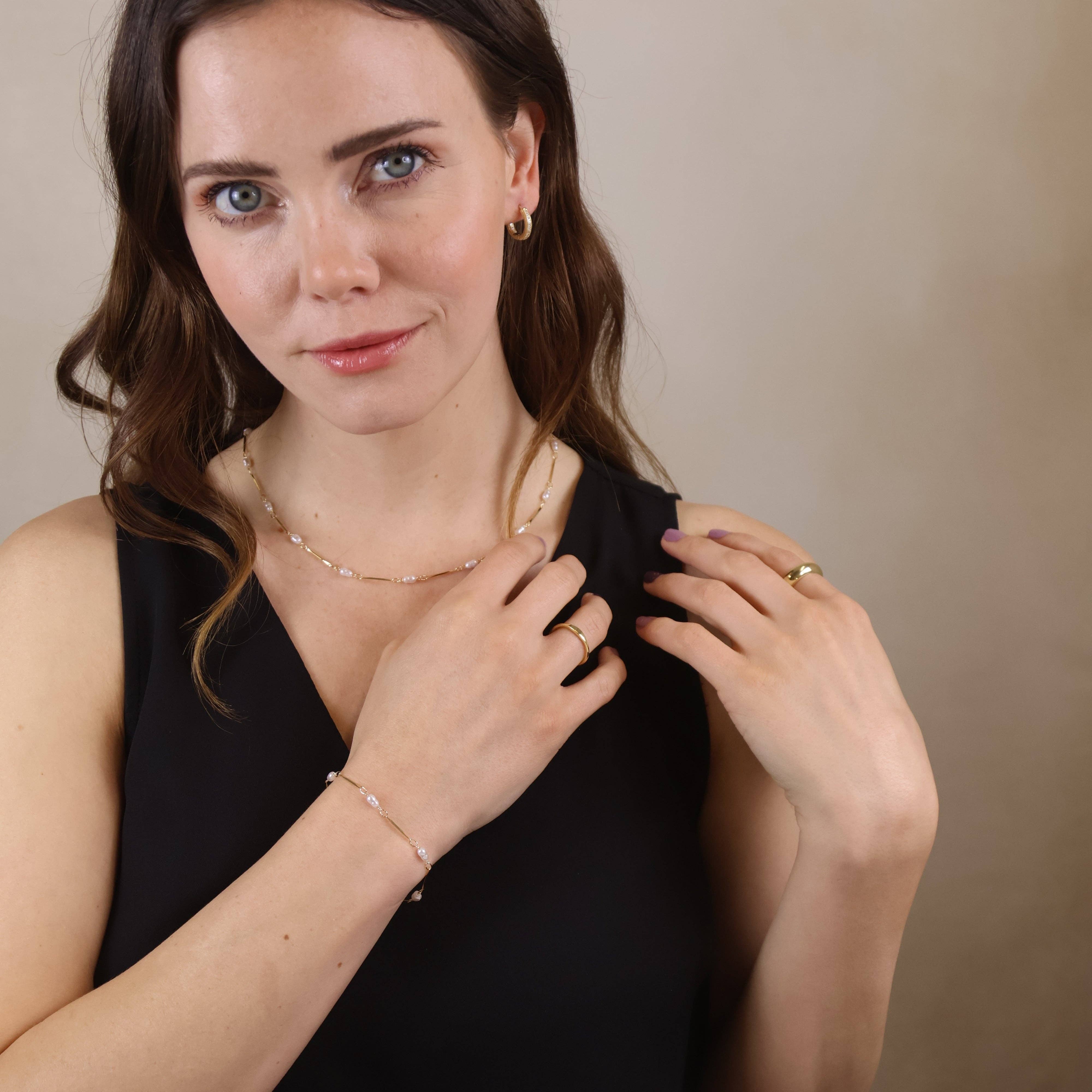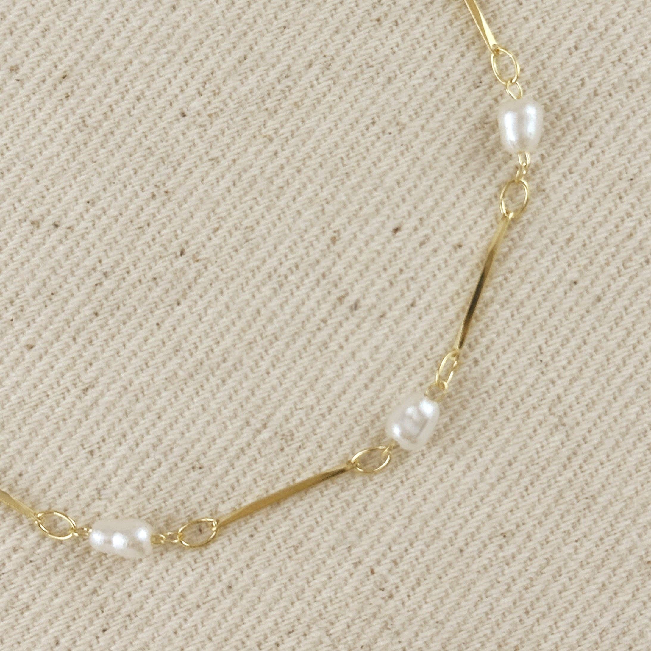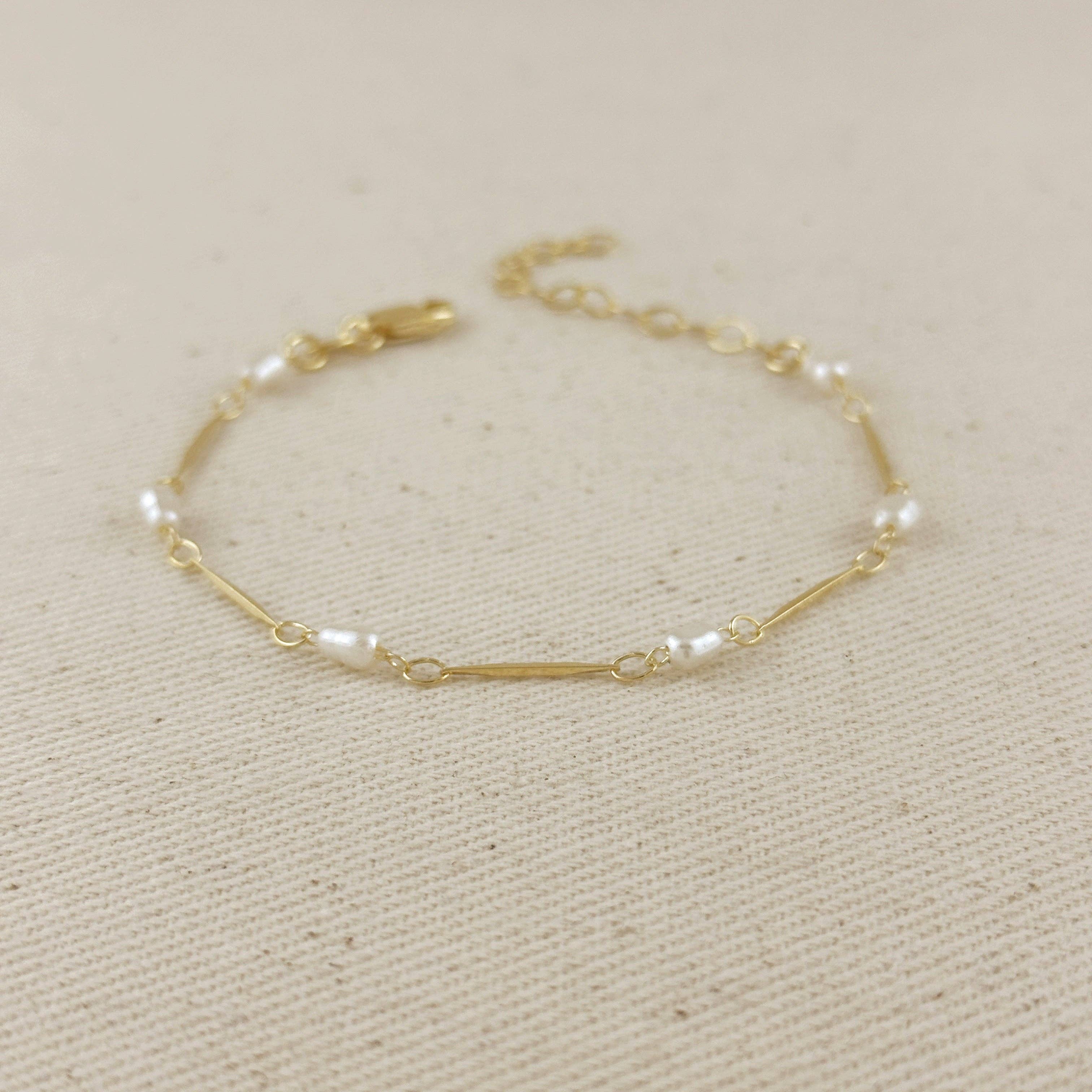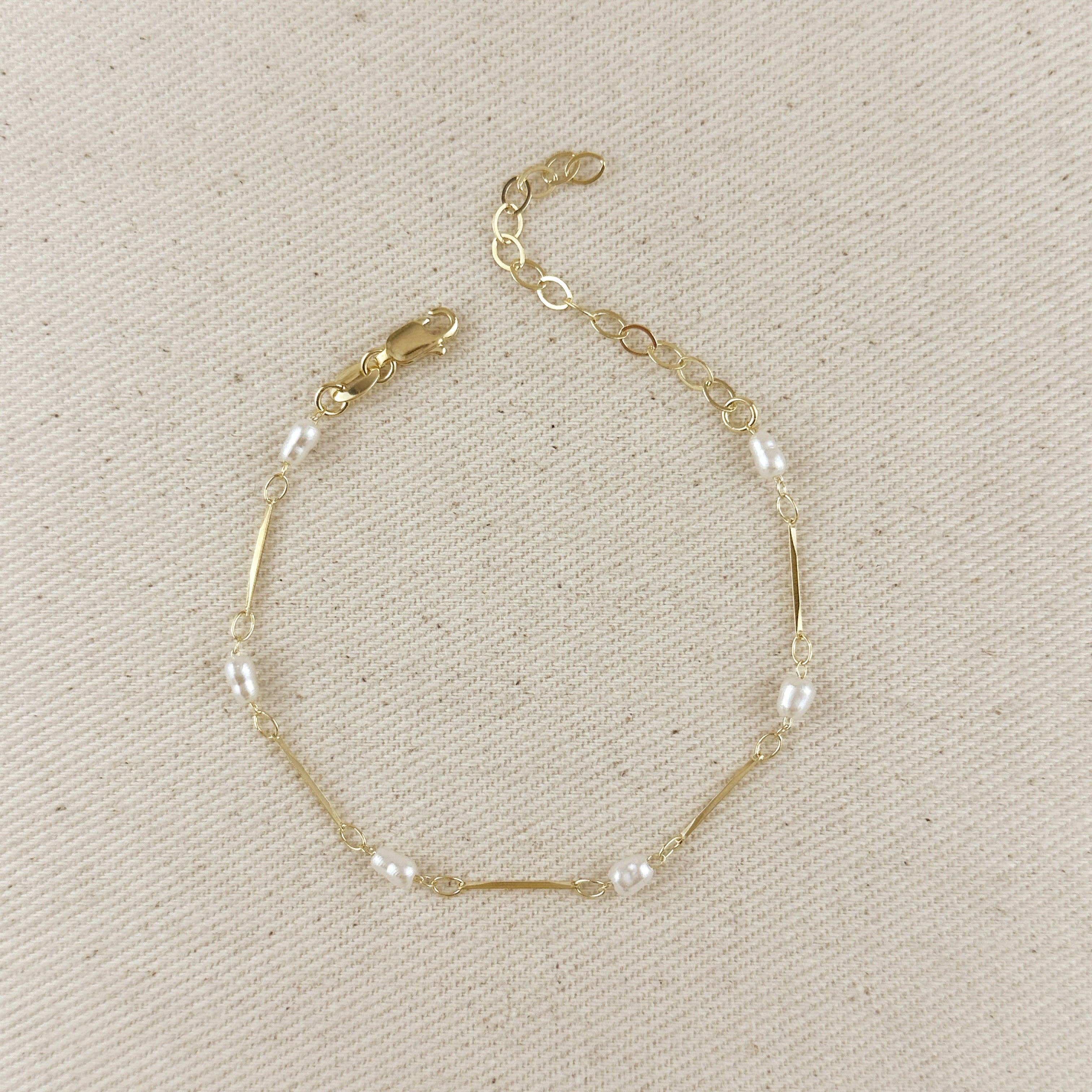 Elevate your everyday style with our elegant 18K Gold Filled Pearl Bead & Straw Bracelet. This delicate piece features lustrous synthetic pearl beads alternating with sleek gold-filled straw links, creating a timeless yet contemporary accessory.