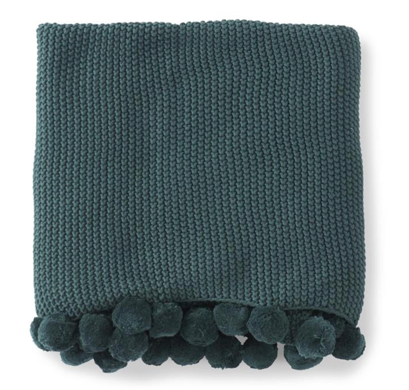 60 Inch Hunter Green Stitch Knit Throw w/Pompom Trim