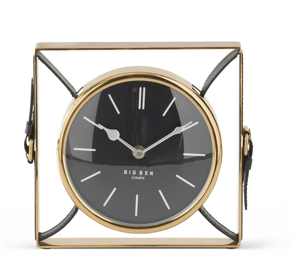 8 Inch Square Gold Metal w/Black Leather Big Ben London Table Clock