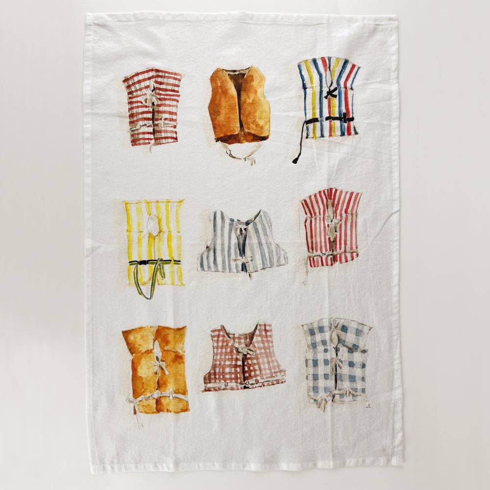 Add a touch of delight to your kitchen with this 100% cotton tea towel. Nine vintage boat coats (my friend's adorable name for "life jackets") cover the towel making it perfect for washing up, lining a basket, or displaying for a cheerful dash of color.
