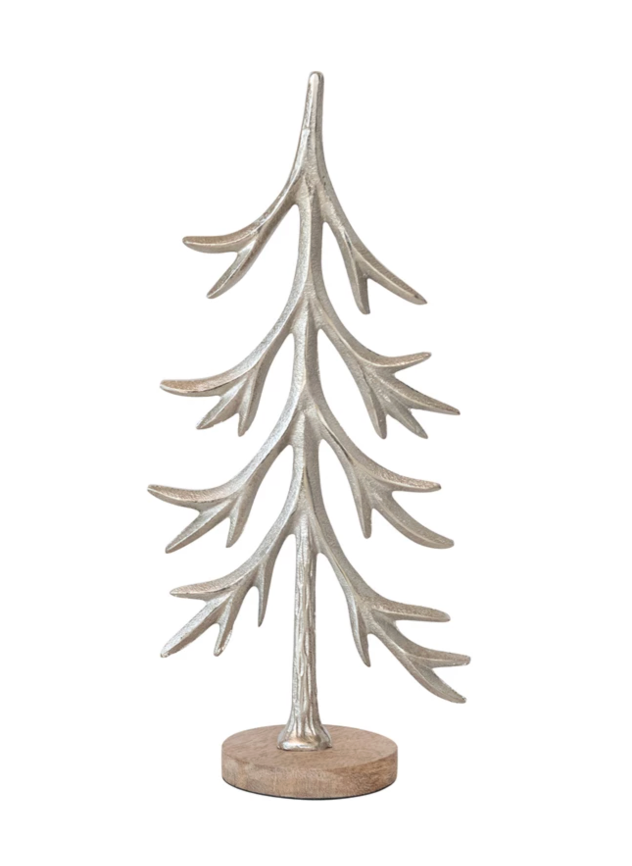 Cast Aluminum Tree with Mango Wood Base, Silver Finish & Natural