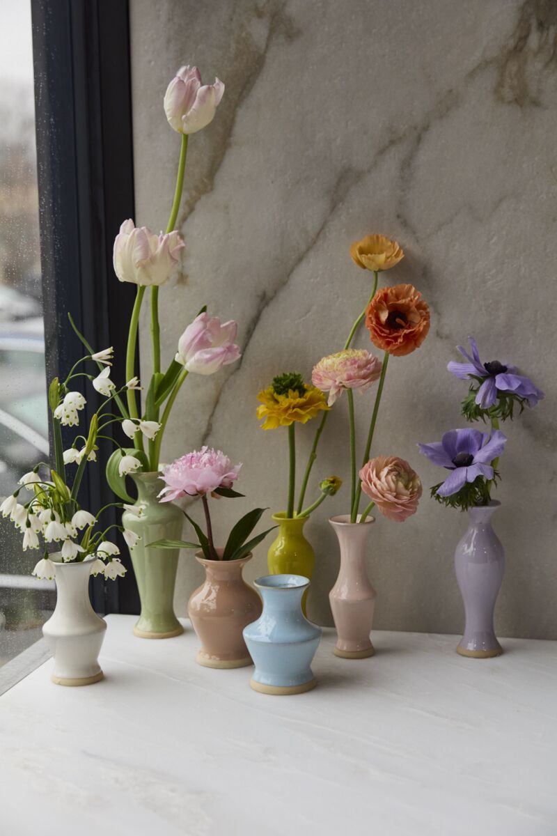 these glossy vases feature a soft rainbow palette with a base of natural bisque to ground the grouping. With unique shapes & sizes for each budvase style, they layer together beautifully with neutral or colorful florals for a dimensional silhouette. The shapes are based on the Chic Budvase, a customer favorite design.