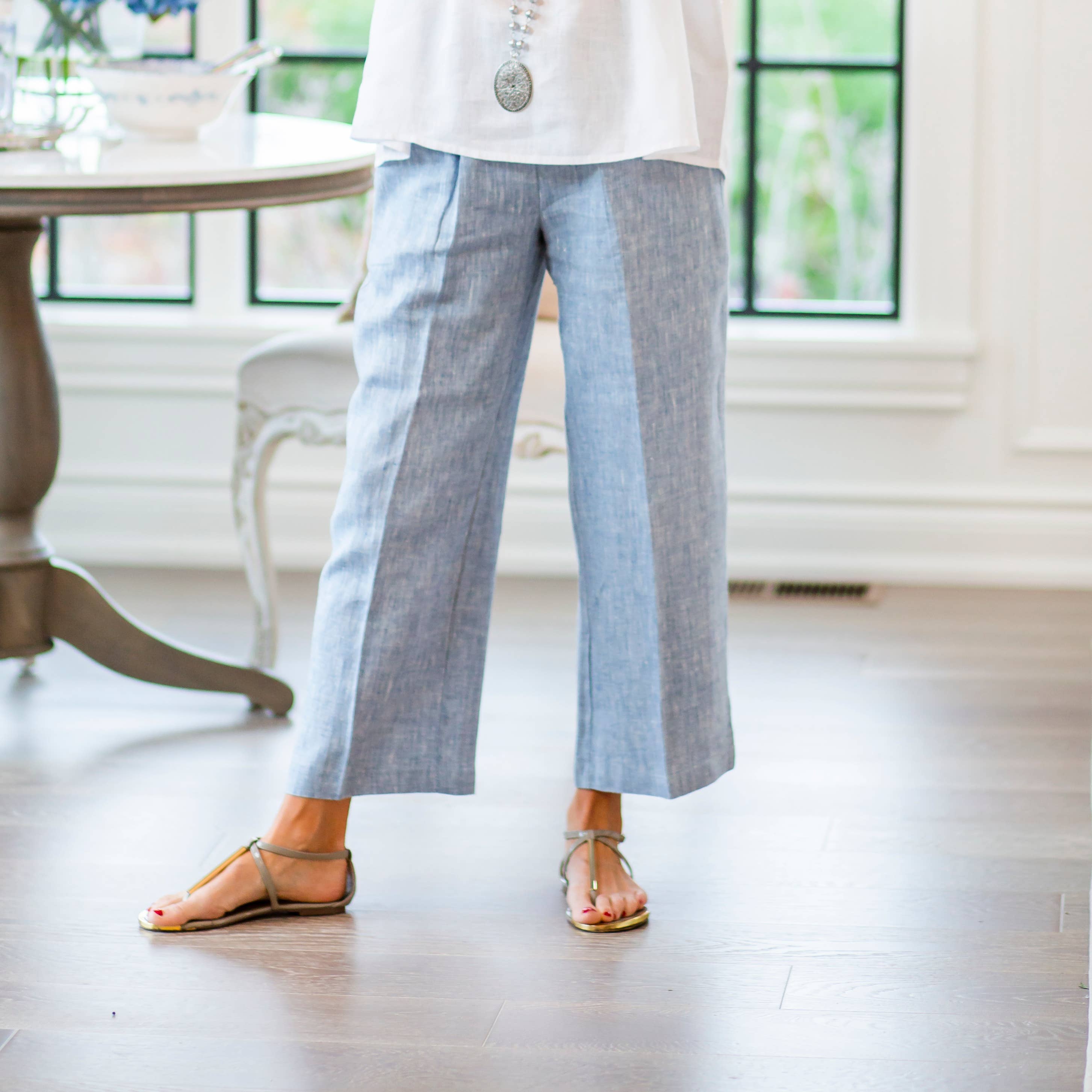 A classic styled, wide-leg capri pant made of 100% European linen. Pant has side pockets and a drawstring waist. Linen is the perfect heat regulator for warm days and an elegant fabric for all occasions.