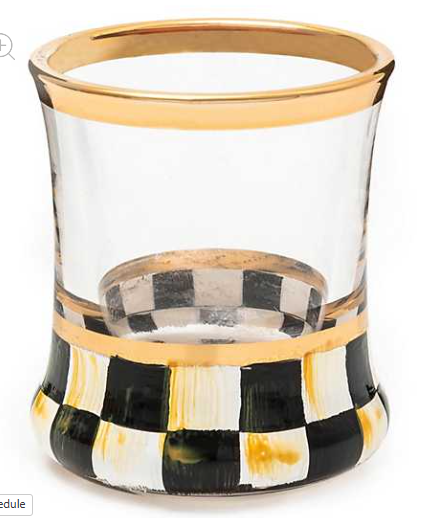 Bottoms up with our hand-painted Courtly Check® Shot Glass. This mouth-blown glass, featuring a base of Courtly Check, is trimmed with gold lustre.
