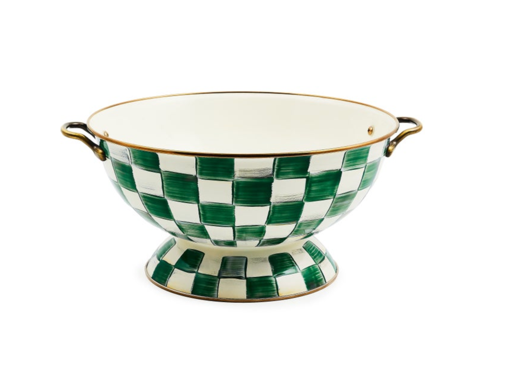 The Emerald Check Everything Bowl, right-sized for beverages on ice or orchard-picked apples, is a must-have for parties and for everyday use. It features a heavy-gauge, hand-glazed steel underbody with hand-painted green checks, a bronzed stainless-steel rim, and antiqued brass-finish handles.