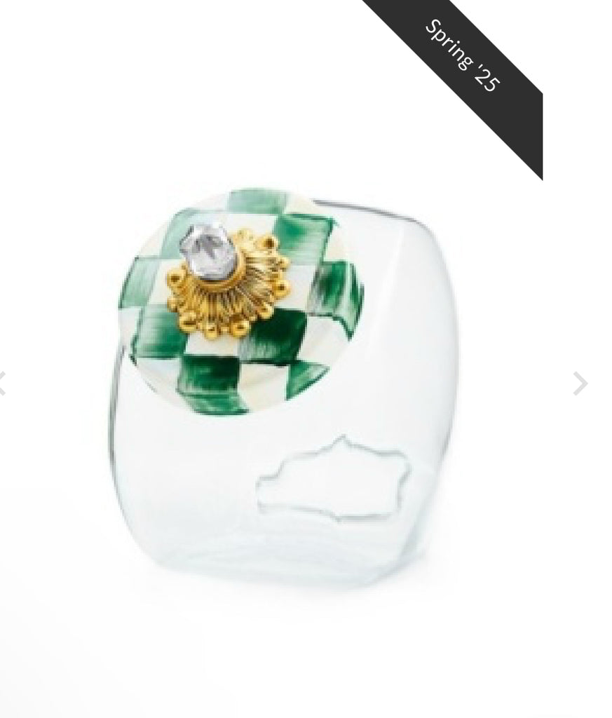 Glass jar; lid has heavy-gauge, hand-glazed steel underbody with hand-painted Emerald Checks. Knob assembly includes brass bobeche and glass finial. Pieces may vary due to the handmade nature of each product