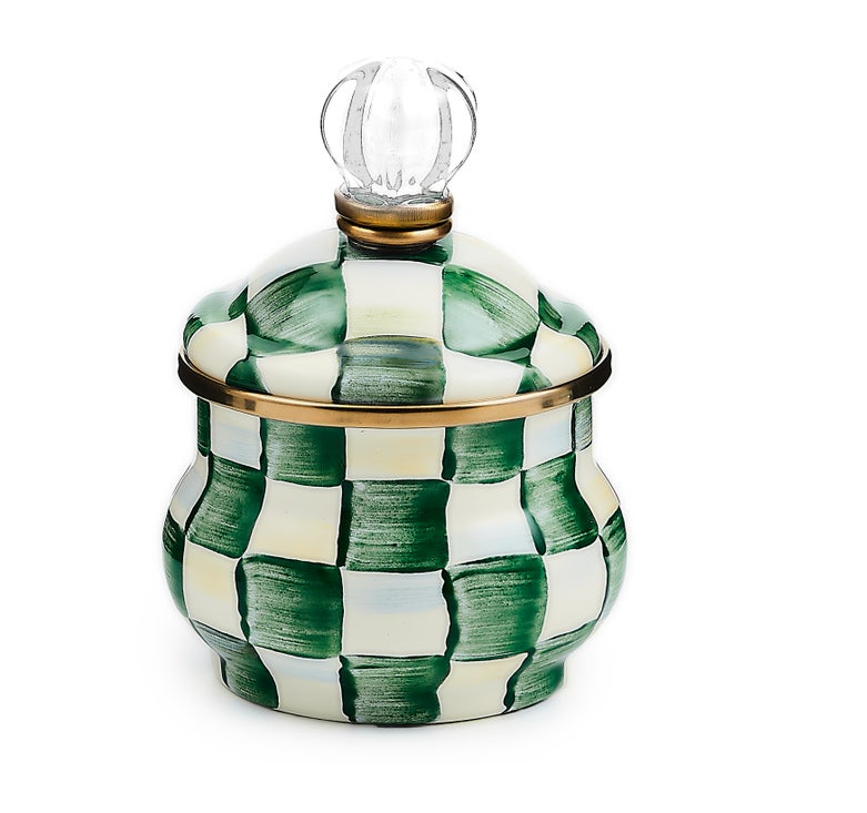Taking your lumps becomes a delight with our Emerald Check Lidded Sugar Bowl—the only question is, one cube or two? And why stop at sugar—this lidded enamel bowl is perfect for jam or sauces, or to hold anything from cotton balls to paper clips. The heavy-gauge steel underbody is glazed with hand-painted green checks, rimmed in bronzed stainless steel, and topped with a clear glass knob.