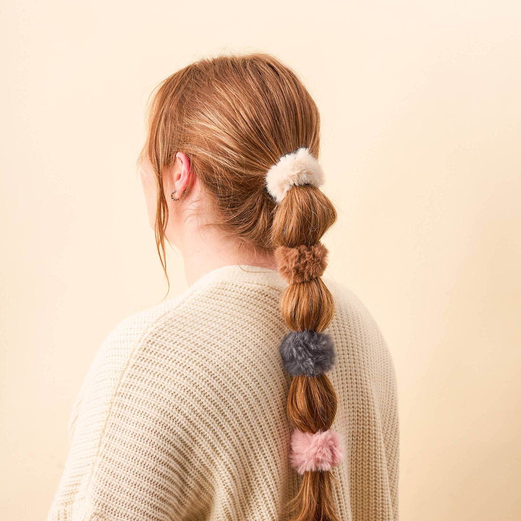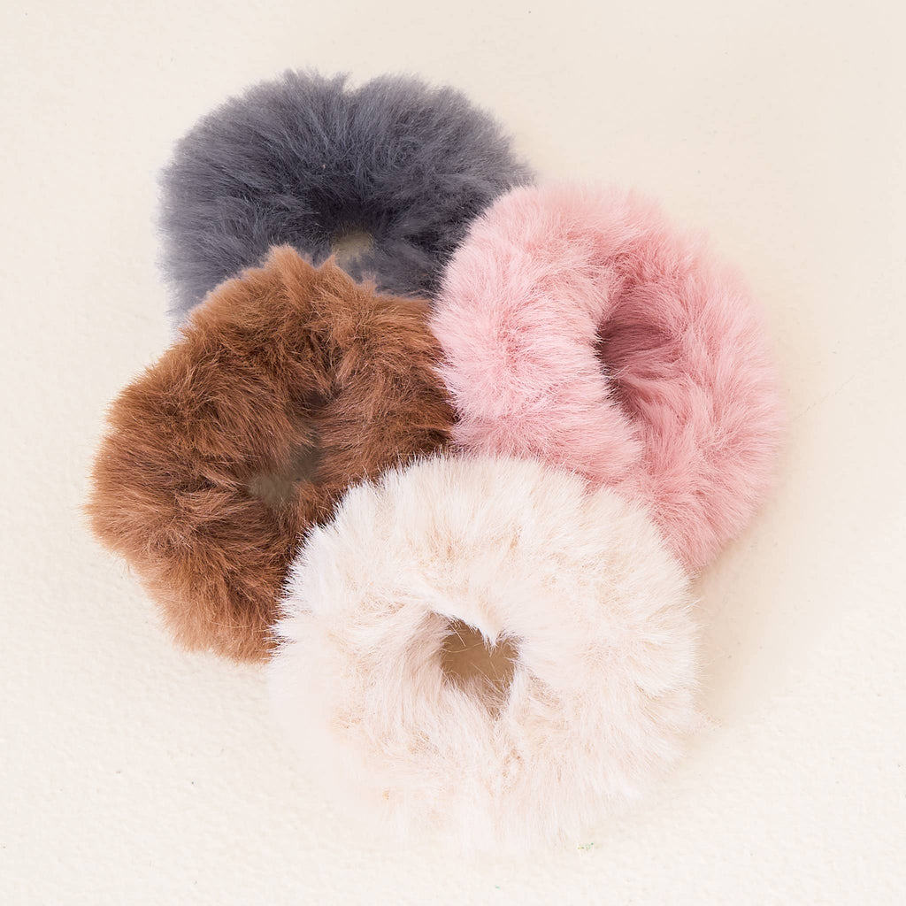 Indulge in luxury with our set of Faux Fur Scrunchies, designed to elevate your everyday hairstyles this season. Crafted from buttery soft and stretchy faux fur, these scrunchies offer a delicate texture that gently protects your hair while adding a touch of elegance to any hairstyle. Set of 4 Perfect as a stocking stuffer! WARNING: Cancer and Reproductive Harm - www.P65Warnings.ca.gov