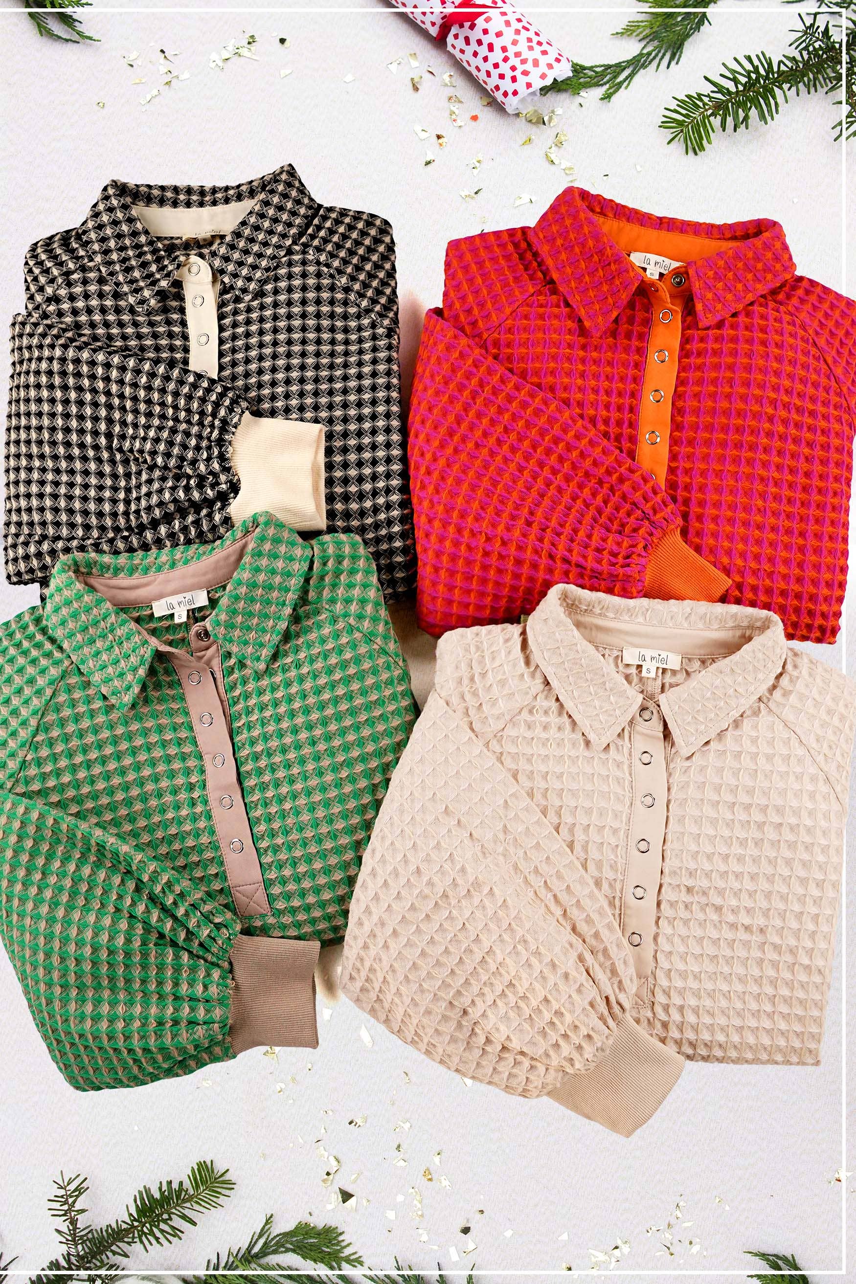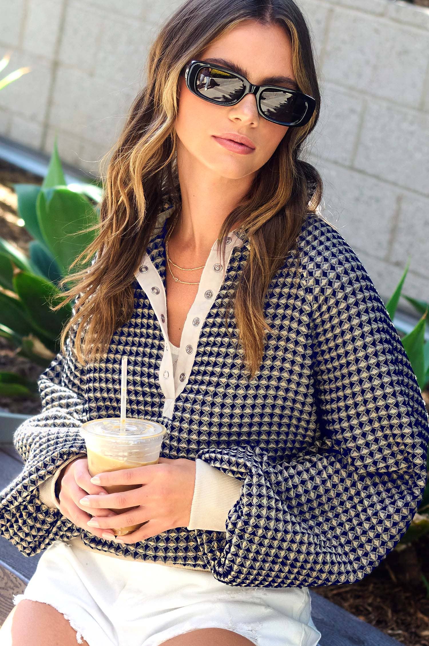 Add shape and texture to your sweatshirt collection with this timeless pullover featured in a piper snap button detailed top in a loose fit. Two tone color way with a pointed collar makes this a more unique style. Stunning textured fabrication designed to add a cool and cozy touch to absolutely any style.