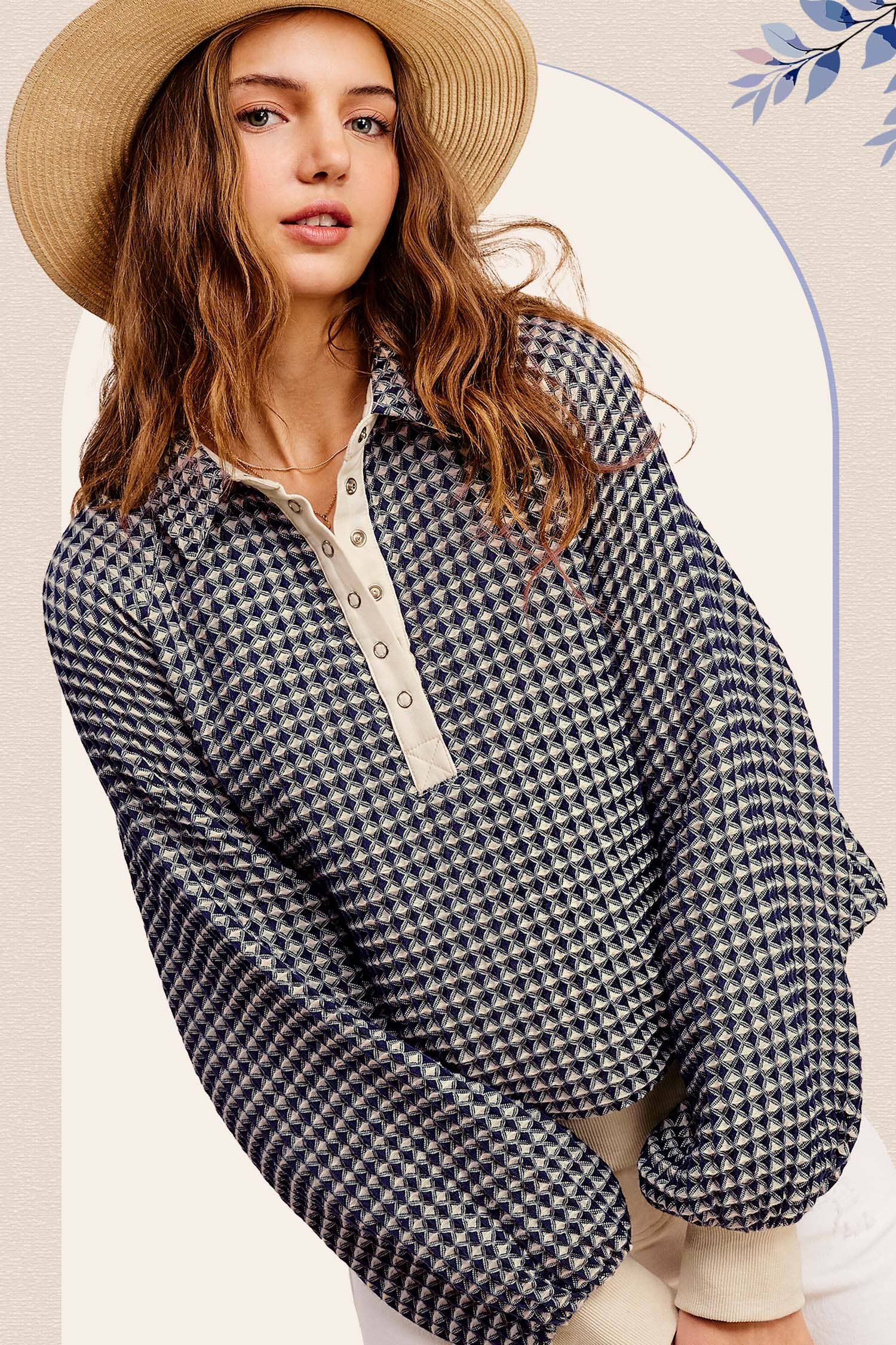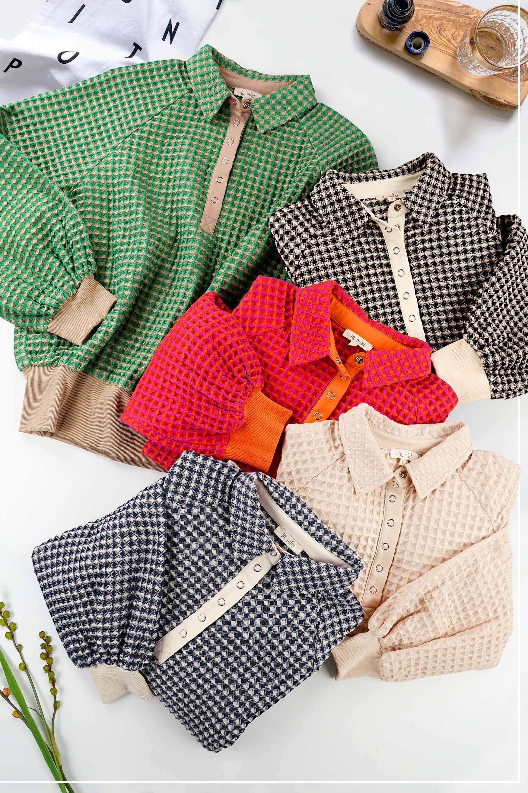 two tone fabric, unique top, long sleeve, snap button front, loose fit, balloon sleeve, puffy sleeve, collared neck
