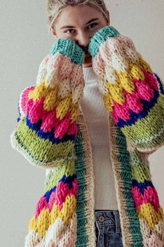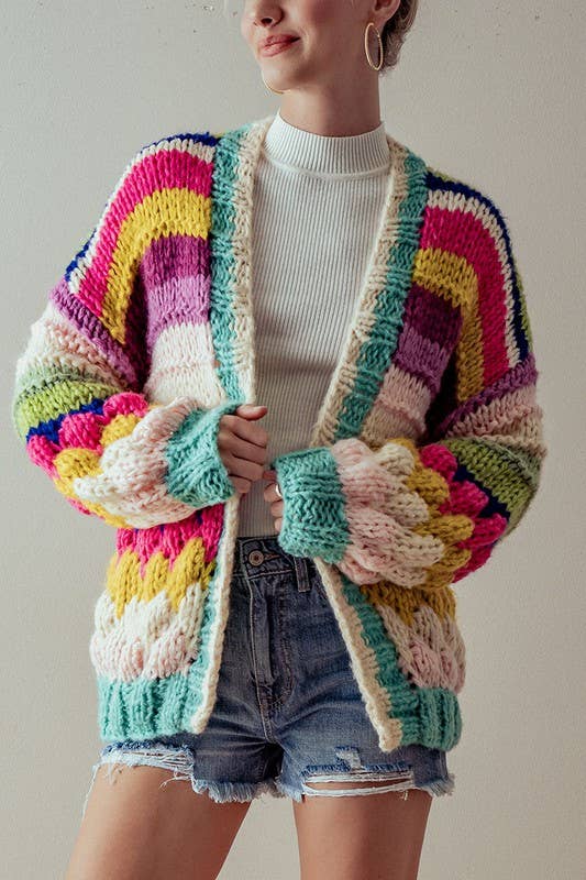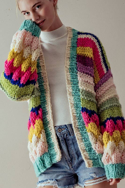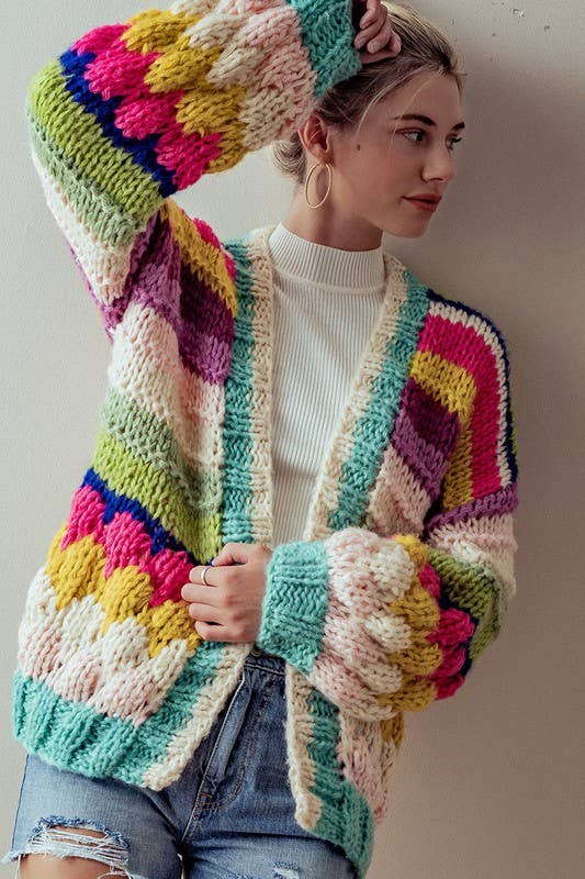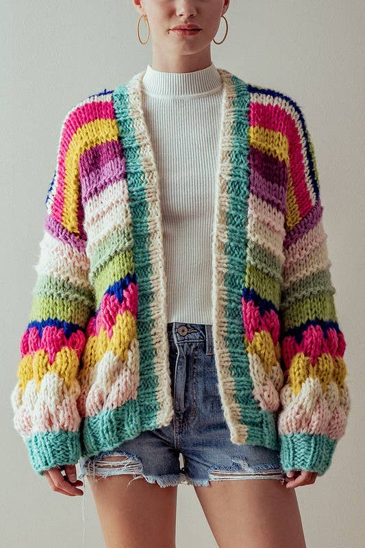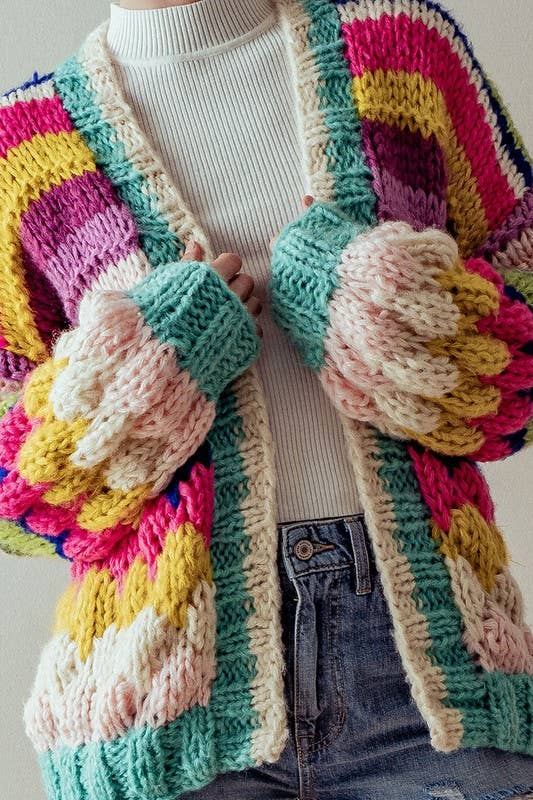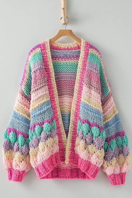 PUFF LONG SLEEVES OVERSIZED FIT OPEN FRONT MULTI COLOR STRIPE CHUNKY KNIT CARDIGAN