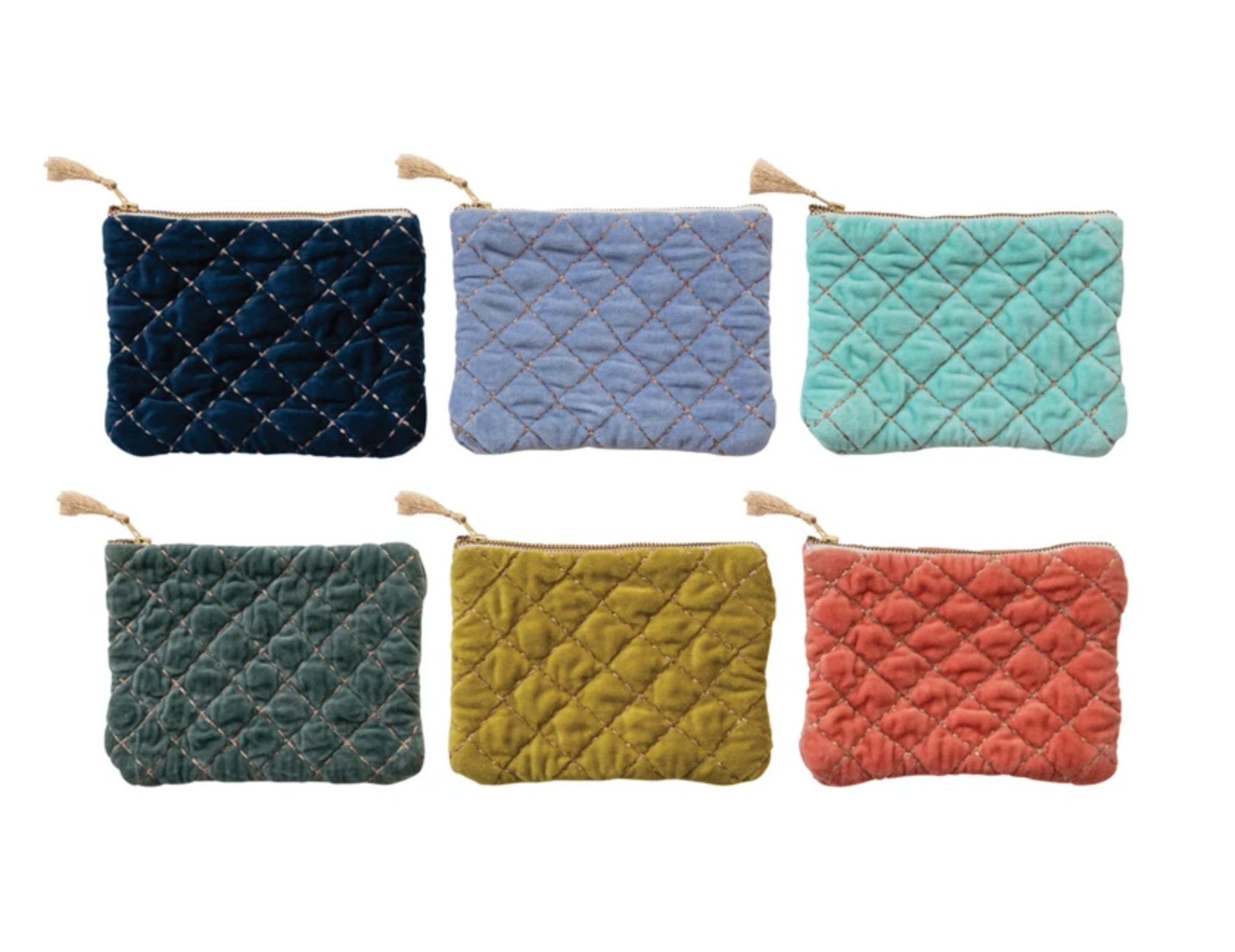 Quilted Cotton Velvet Zip Pouch w/ Metallic Thread Embroidery & Tassel, 6 Colors