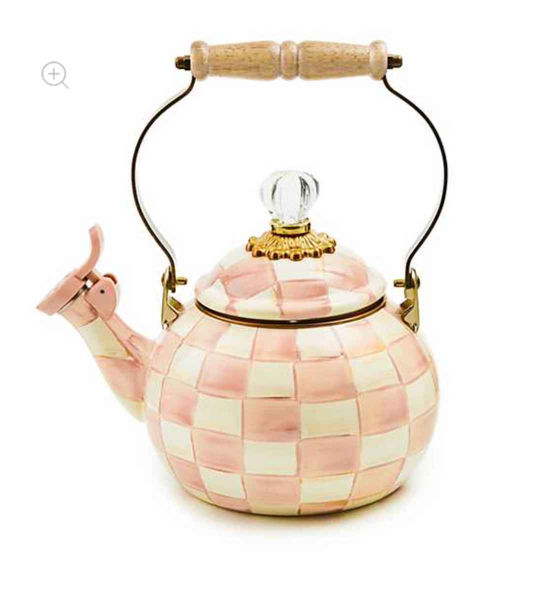 Bubbling over with MacKenzie-Childs style, our Rosy Check® Whistling Tea Kettle will tell you when it’s time for tea. The heavy-gauge steel underbody is glazed with checks hand-painted in a range of rosy hues and topped with an elegant clear glass knob.