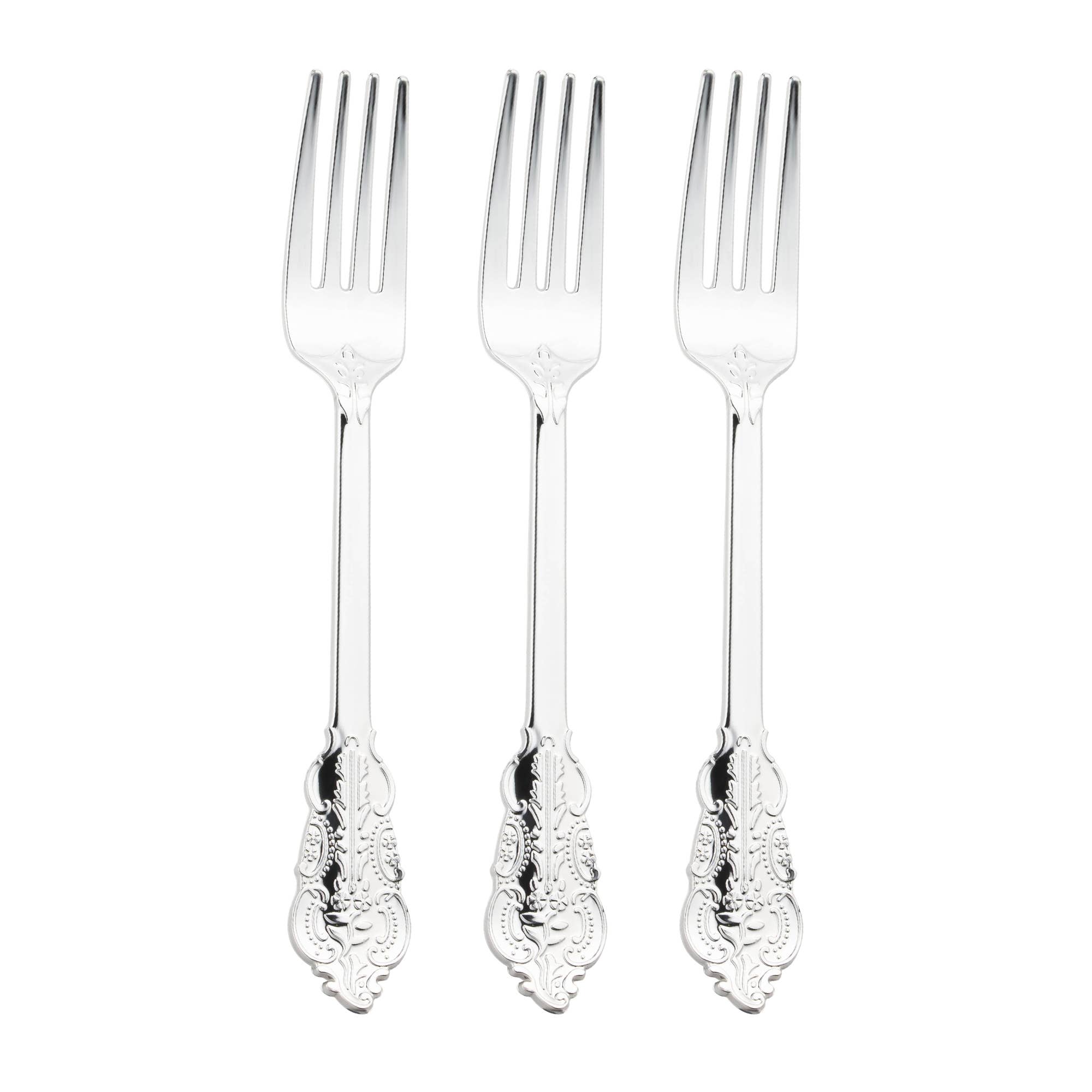 Sophistication meets convenience with these elegant disposable plastic forks. Delight your guests with the elegance of these meticulously crafted utensils, featuring a radiant silver finish reminiscent of classic Baroque aesthetics. Perfect for upscale events, weddings, or formal dinners, each fork exudes luxury without the hassle of traditional silverware. Made from high-quality plastic, these forks offer durability and style, adding a touch of glamour to any table setting. Elevate your dining experience with the timeless charm of these fancy plastic forks, ensuring every meal is served with grace and refinement.