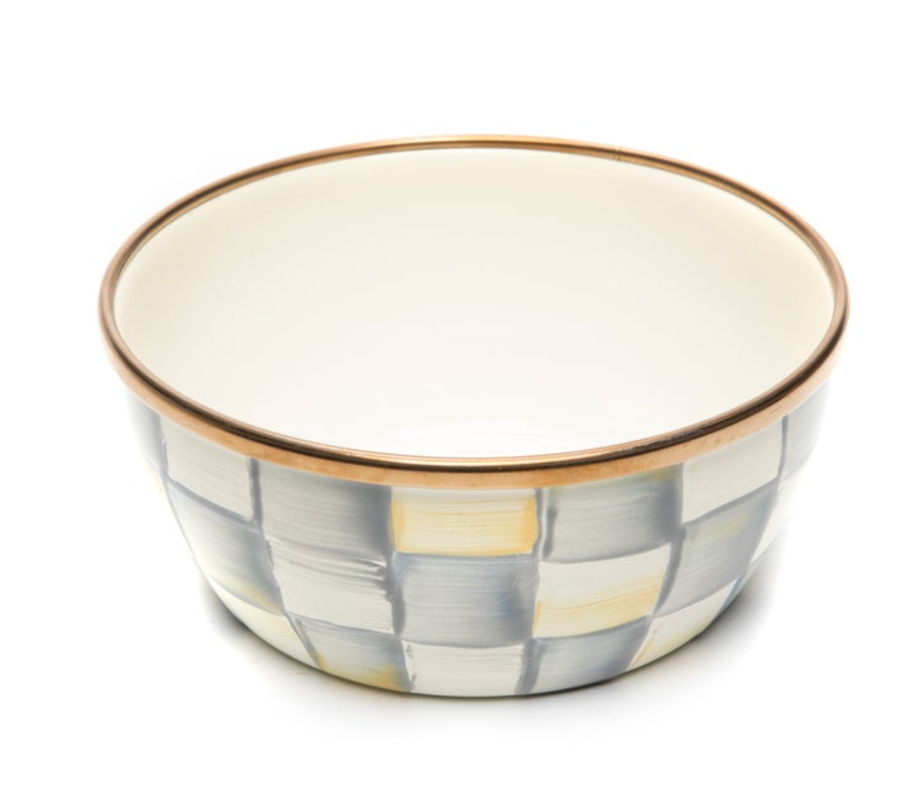 For masters of mise en place, our Sterling Check Pinch Bowl makes prep work a stylish snap. With its just-right size and our grey and white checked pattern, this petite enamel pot is equally charming when brimming with paper clips in a home office or lemon wedges on the wet bar. The heavy-gauge steel underbody is glazed with hand-painted, color-dragged grey checks that are similar in theme to our popular Courtly Check® and rimmed in bronzed stainless steel.