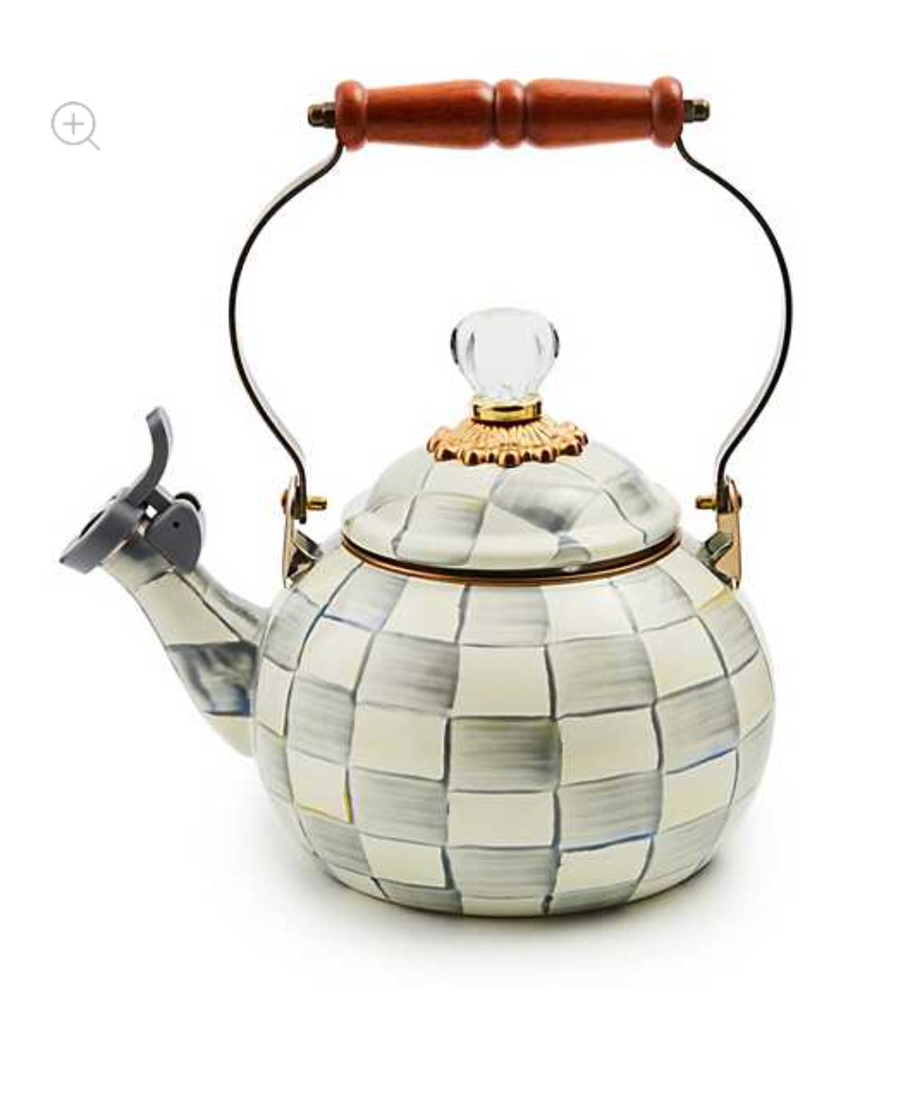 Bubbling over with MacKenzie-Childs style, our Sterling Check® Whistling Tea Kettle will tell you when it’s time for tea. The heavy-gauge steel underbody is glazed with hand-painted grey checks and topped with an elegant clear glass knob.