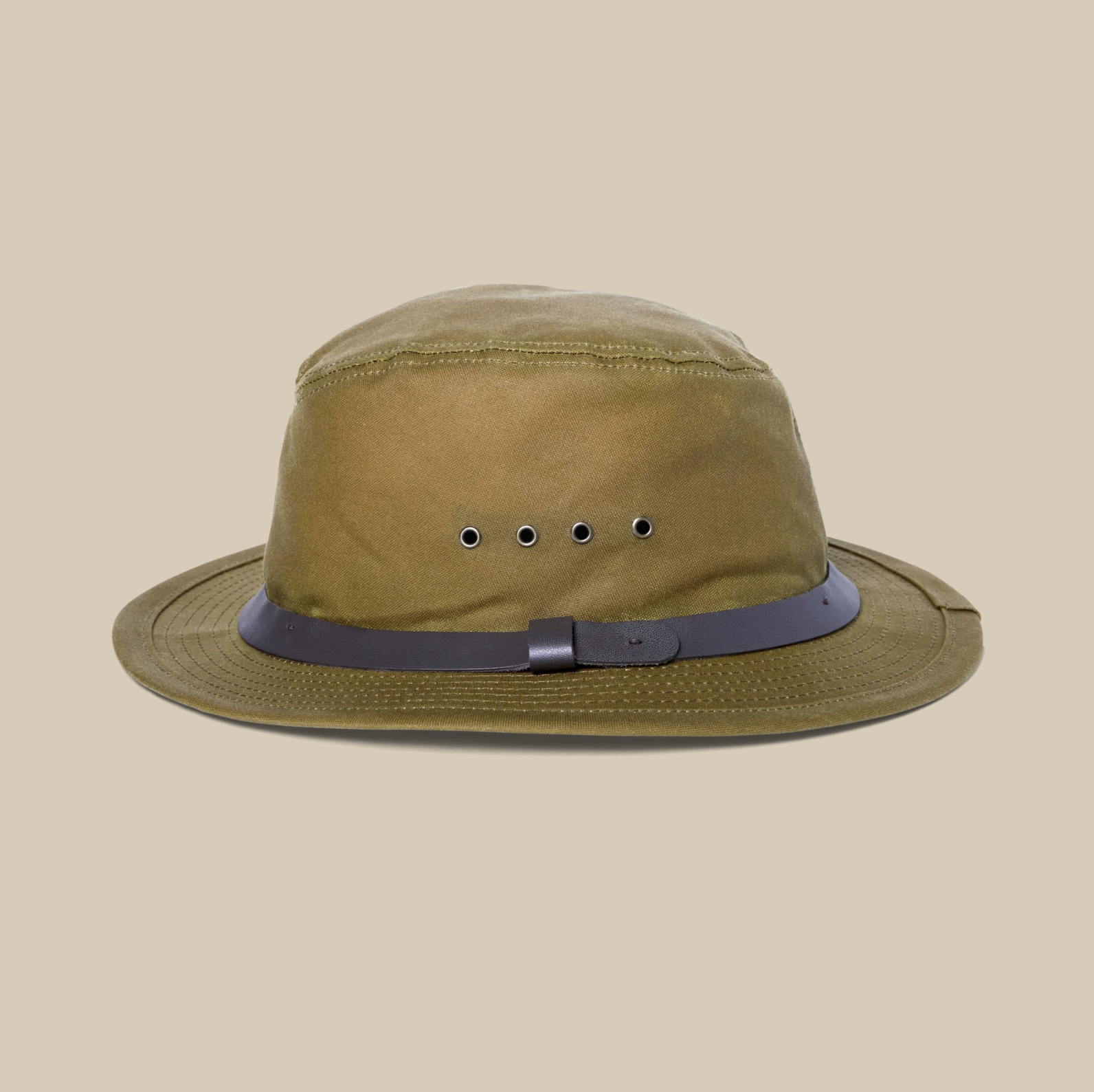 Whether in the field or on the job, our classic Tin Cloth Packer Hat keeps you protected from the elements. Water-resistant oil finish Tin Cloth fabric withstands abuse for decades. Features a cotton sweatband, a leather hatband, and ventilating grommets in the crown. A 2.25-inch brim keeps the rain out of your face and off your neck.