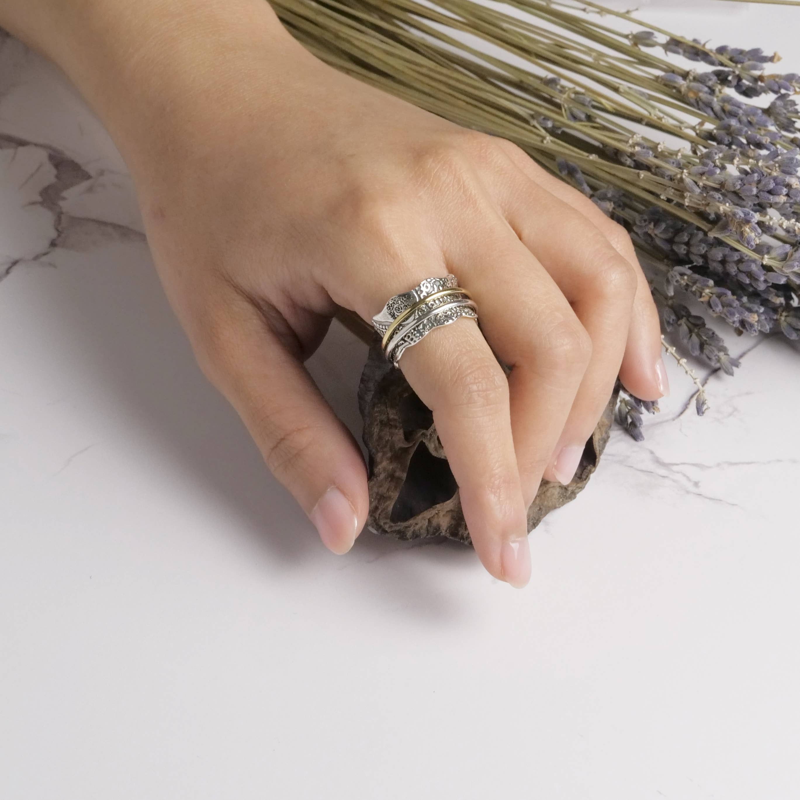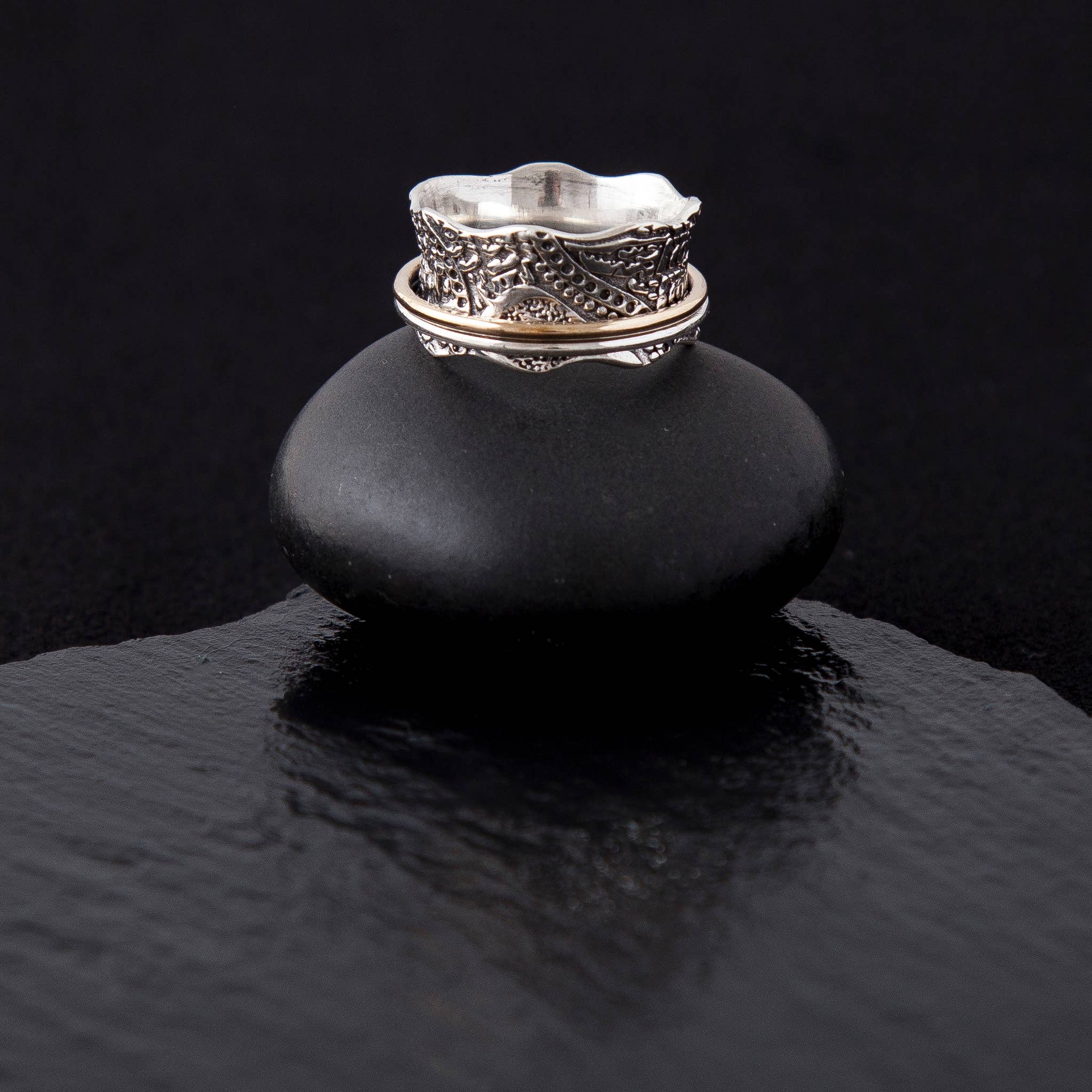 Wave sterling silver spinner ring with decorative etched design. Our spinner rings are handmade with sterling silver and natural stones by silversmith artisans in Rajasthan, India. Inspired by the ancient prayer wheels of Tibet, you can spin the bands on your ring to reduce anxiety and support your own meditation practice. Perfect for spa, yoga and wellness shops!